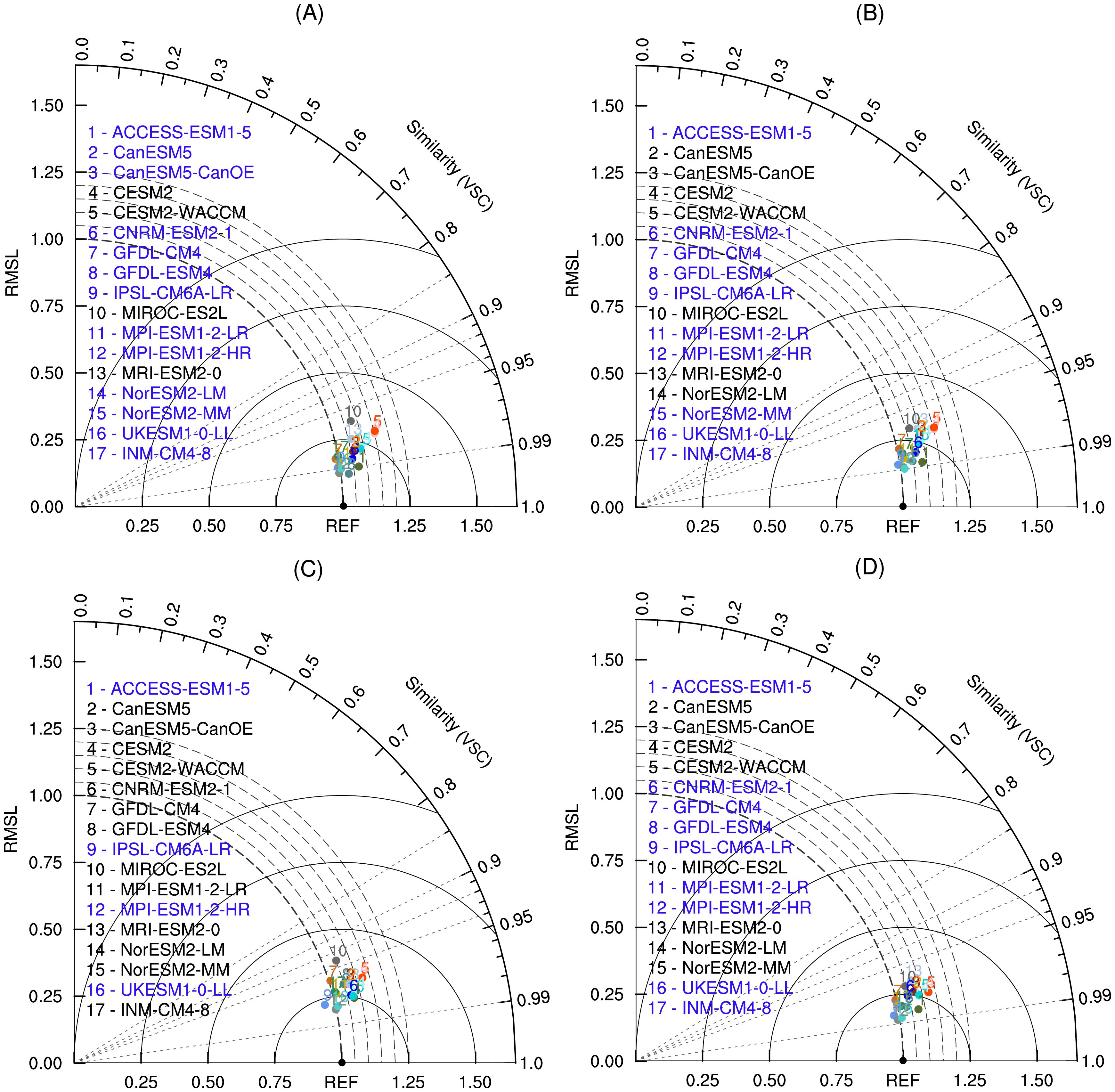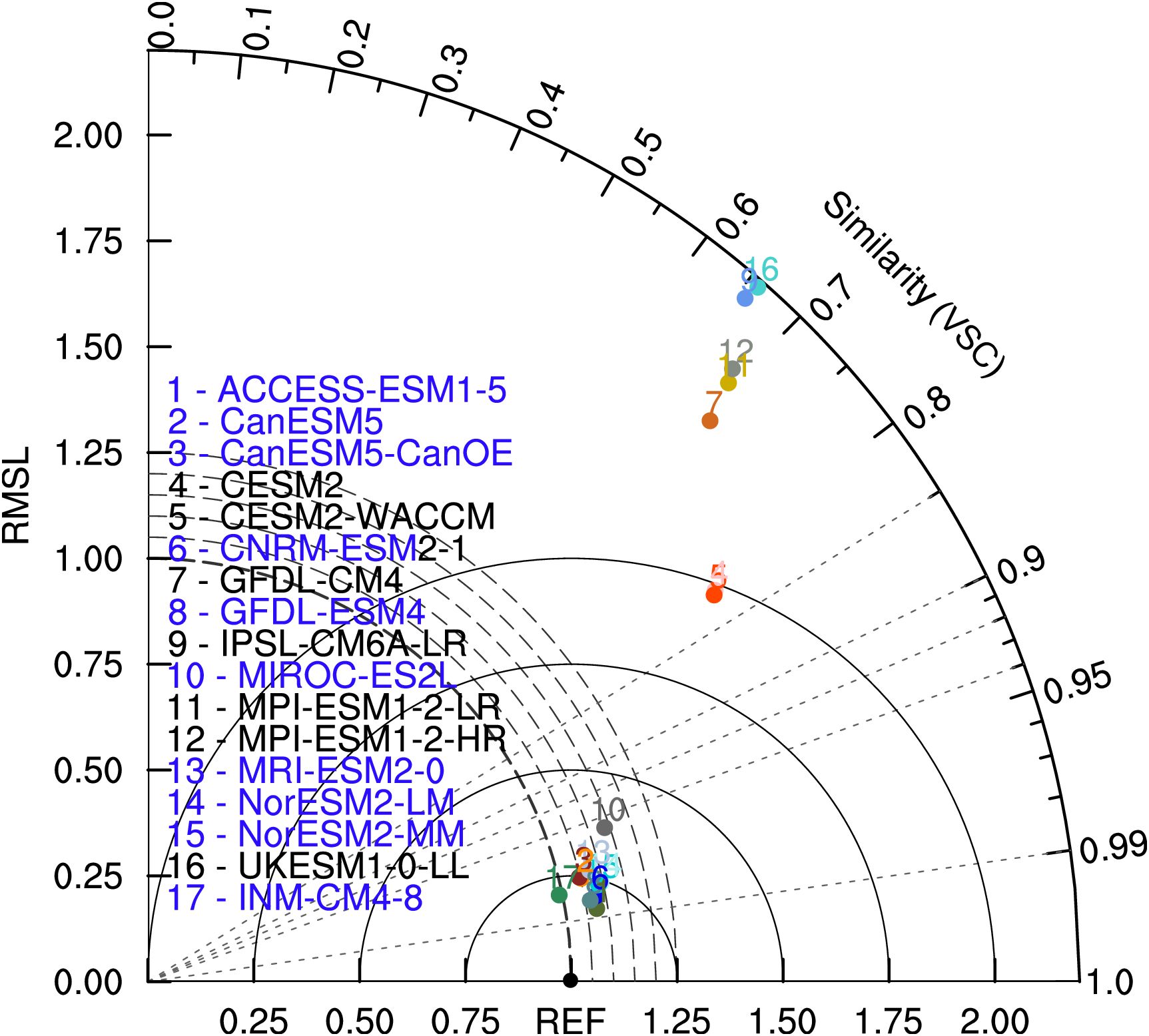 Figure 4. Normalized uncentered VFE diagram of climatological annual mean vector field. The azimuthal position gives the VSC, the radial distance from the origin indicates the RMSL, and the distance between the model and the reference point denotes the RMSVD. The RMSL and the RMSVD are normalized by the RMSL derived from reference data. Different colors and ID numbers represent different CMIP6 ESMs, and the matching relationship between the number and the mode is shown in the legend. The reference data is represented by ‘REF’ (the black point). The blue names of ESMs denote that the differences of the RMSL between the ESMs and reference data are less than 0.5.