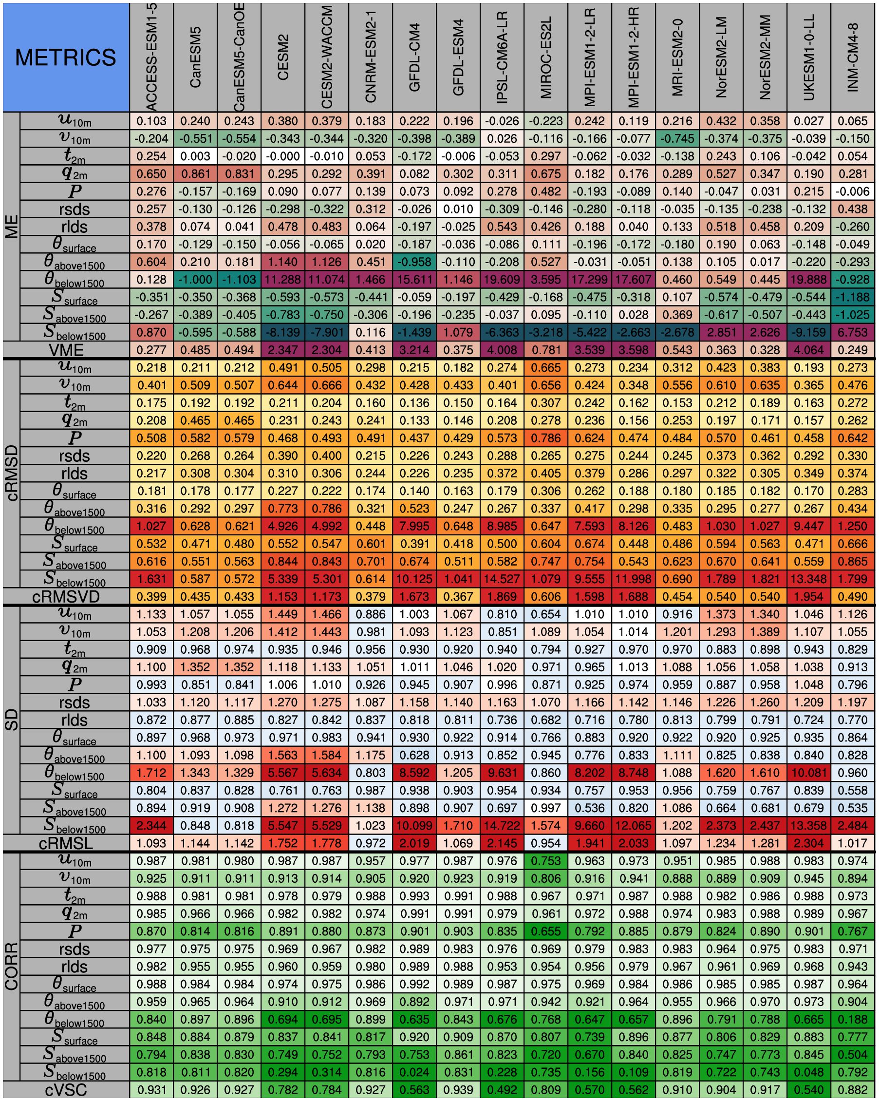 The VFE diagram provides insights into the model abilities of ESMs by the VSC and RMSL. To show the performance of ESMs in detail, we further assess more statistical metrics (Figure 5). In addition, we calculated the cMISS to show the multivariable integrated skill, which takes the cVSC and SD into account together. The metrics table adopted the centered statistics that decompose the original fields into anomaly and mean fields. Evaluations of anomaly fields are conducted from three perspectives: the variance characteristics (SD, cRMSL), the spatial pattern consistency (CORR, cVSC), and the root-mean-square differences between the reference data and ESMs results (cRMSD, cRMSVD). The ME is also incorporated in Figure 5 to show the systematic biases of the simulated original fields of ESMs from the reference data.