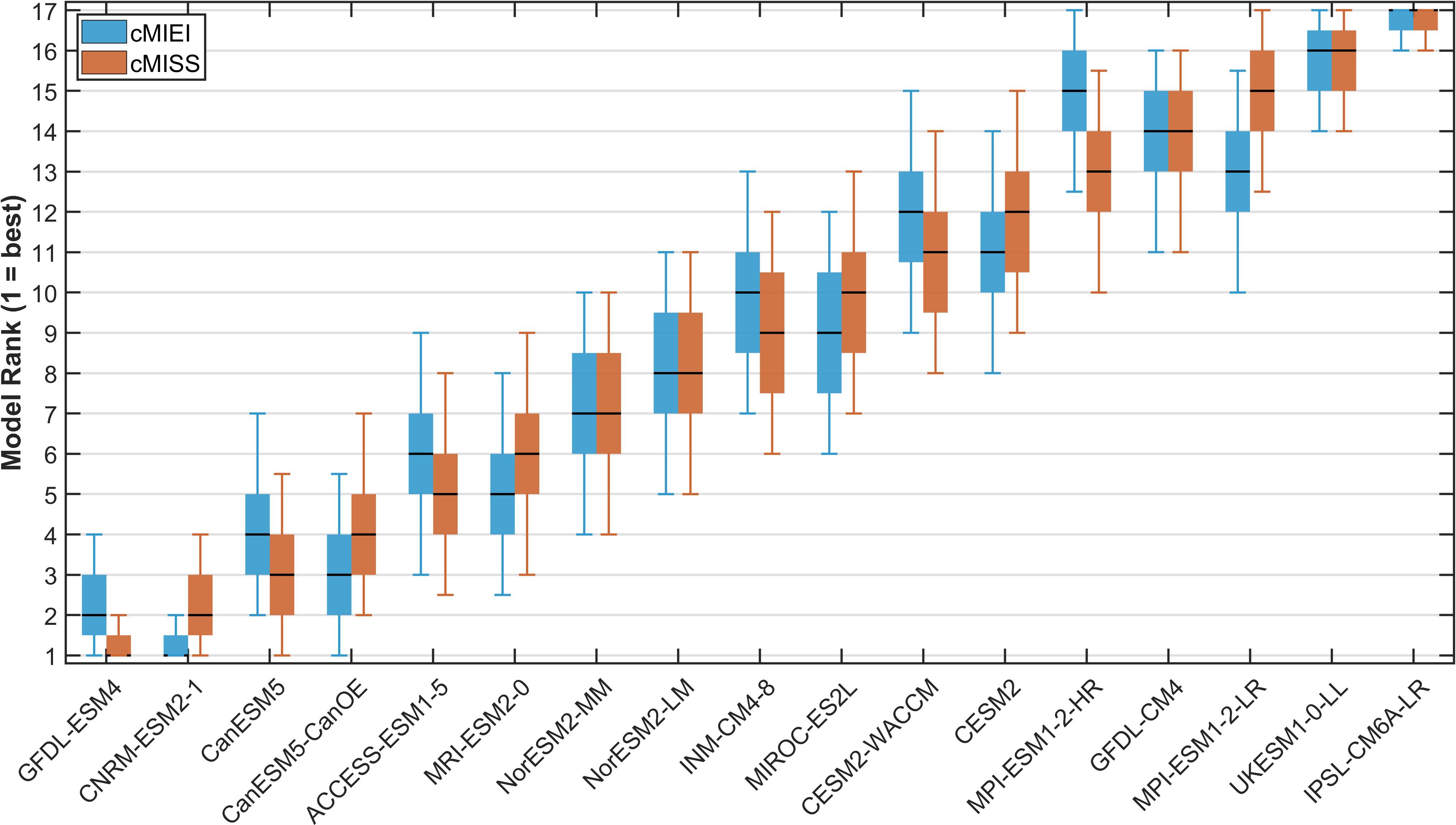 Figure 11. Bootstrap evaluation of the performance of ESMs based on the cMISS and cMIEI values. The boxplots illustrate ranking distributions of 17 CMIP6 models derived from the climatological annual mean (blue color denotes the cMIEI; orange color denotes the cMISS), with rankings obtained through 10,000 bootstrap resampling iterations. Each box represents the interquartile range and median, with the whiskers indicating the 90% confidence interval. Better model performance is indicated by lower rank values (numerically smaller), corresponding to lager cMISS values or lower cMIEI values. Models are ordered along the x-axis by descending cMISS values, positioning better-performing models toward the left side of the figure.