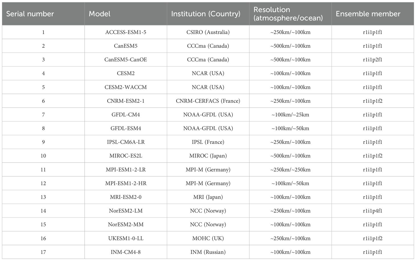 The analysis in this study utilizes a single ensemble member (r1i1p1f1 or equivalent) of the CMIP6 historical experiments. For the ESMs that have not provided the r1i1p1f1 ensemble member, equivalent ensemble members are selected.