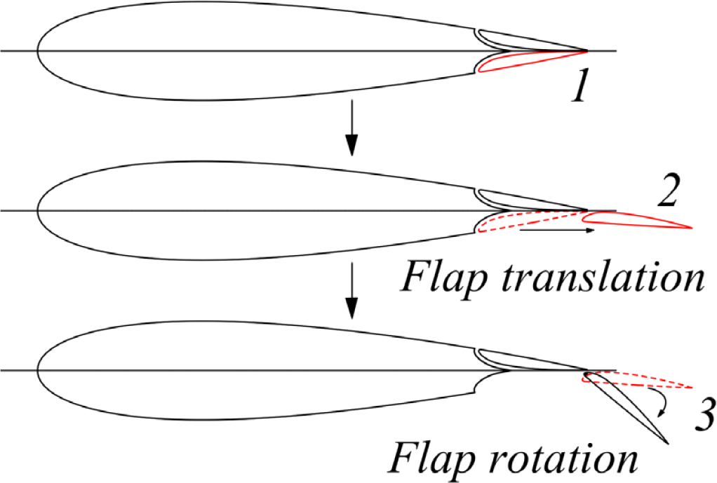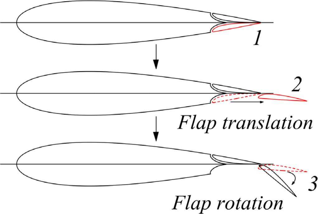 Fowler flap has a larger lift increment than ordinary single slot flap, and its structure and motion mechanism are simpler than double slot or multi slot flap, which is more conducive to the optimization of lift. It has more and more applications in large civil aircraft.Tian (Tian et al., 2017) studied the aerodynamic characteristics of variable radian Fowler flap through numerical simulation, and found that when the lift coefficient is greater than the critical value, the radian is conducive to improve the lift drag ratio; This critical value is different under different conditions. The takeoff and landing configuration is optimized with 30% chord Fowler flap. DeSalvo (Desalvo et al., 2014; Desalvo et al., 2020) used active aerodynamic flow control to improve the lift of hydrofoil. The hydrofoil uses the structure of Fowler flap and simple flap. This is achieved by driving the spanwise arrangement of fluid oscillating jets upstream and downstream of the leading edge of the flap. These jets increase the flow attachment range along the flap surface under deflection of up to 60°. The driving makes the performance of Fowler flap significantly improved compared with the optimized baseline configuration (the lift coefficient is increased by 30%), and the high lift performance of single element simple flap without cross flow gap can match or exceed the performance of the optimized baseline Fowler configuration. Steinbuch (Steinbuch et al., 2008) introduced the design of double slotted Fowler flaps designed for high-speed acrobatic aircraft. The design of double slotted Fowler flaps is part of the effort to reduce the aircraft’s landing speed, especially when the stall speed is reduced to 90 knots. In the low-speed wind tunnel test, the maximum lift of the target is tested. The increment of the designed Fowler flap to the maximum lift coefficient of the section is about 0.4 larger than the literature value. The stall speed at landing is equal to 90 knots. A multi-objective and multipoint optimization problem is presented by Ernesto Benini dealing with a multi-element hydrofoil used in high-lift devices. The final Pareto Optimal solutions are presented and the reasons for improved performance are discussed (Benini et al., 2011). In Yang’s experiment, particle image velocimetry (PIV) was employed for flow visualization over the upper surface of the flap. The PIV results demonstrate that the flow separation on the flap is suppressed completely by the same DBD actuators used in the simulation (Yang et al., 2016). Van Dam believes that multi-element high-lift system must be as simple and economical as possible while meeting the required aerodynamic performance levels (van Dam, 2002). Bouzaher, MT (Bouzaher et al., 2025) proposes a new type of expandable frontal flap (EFF) to improve power extraction efficiency of a flapping foil, and found that this design is capable of increasing the efficiency by 17% relative to the conventional reversed D-shaped trajectory and by 20% as compared to vertical path.