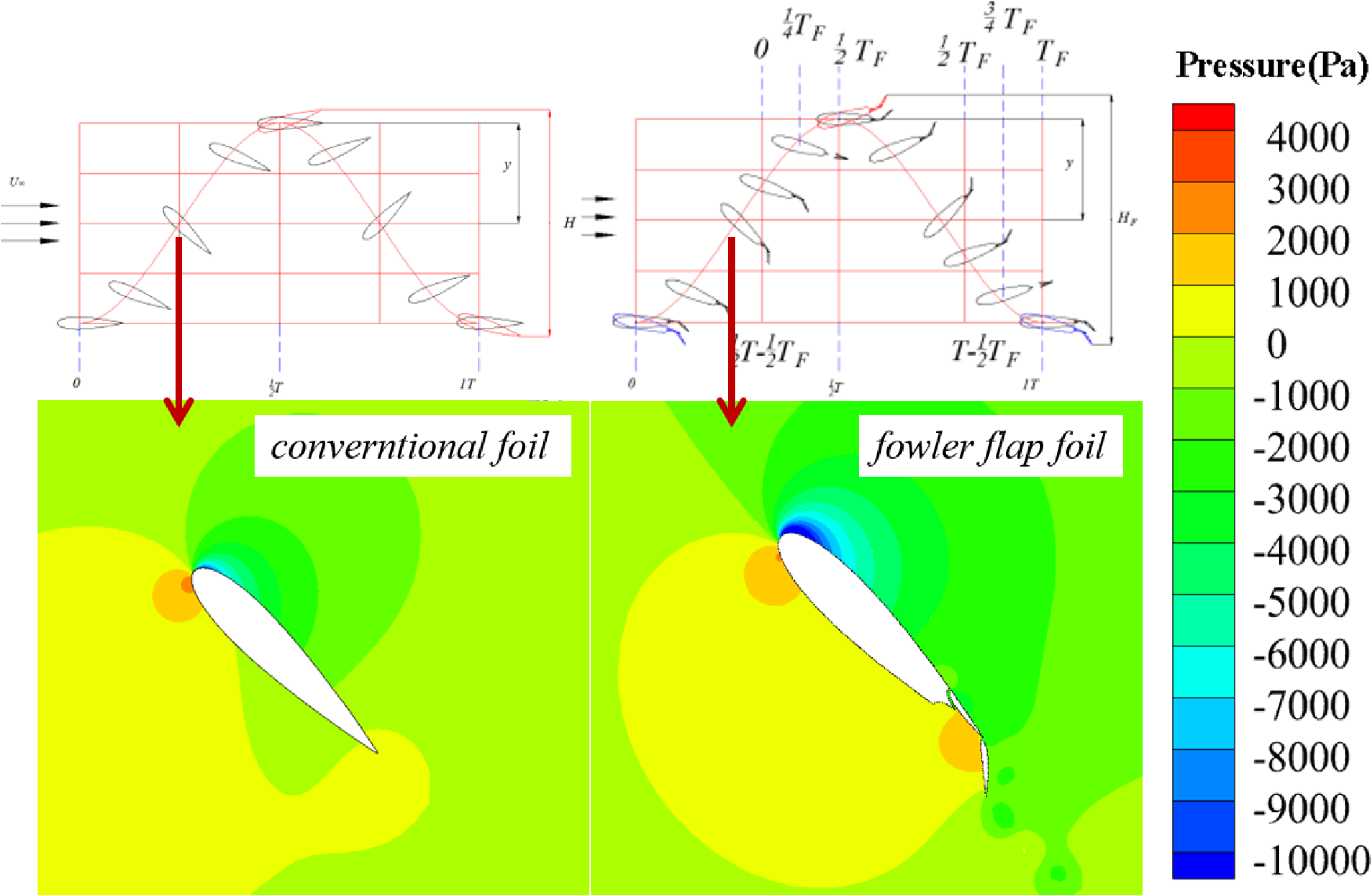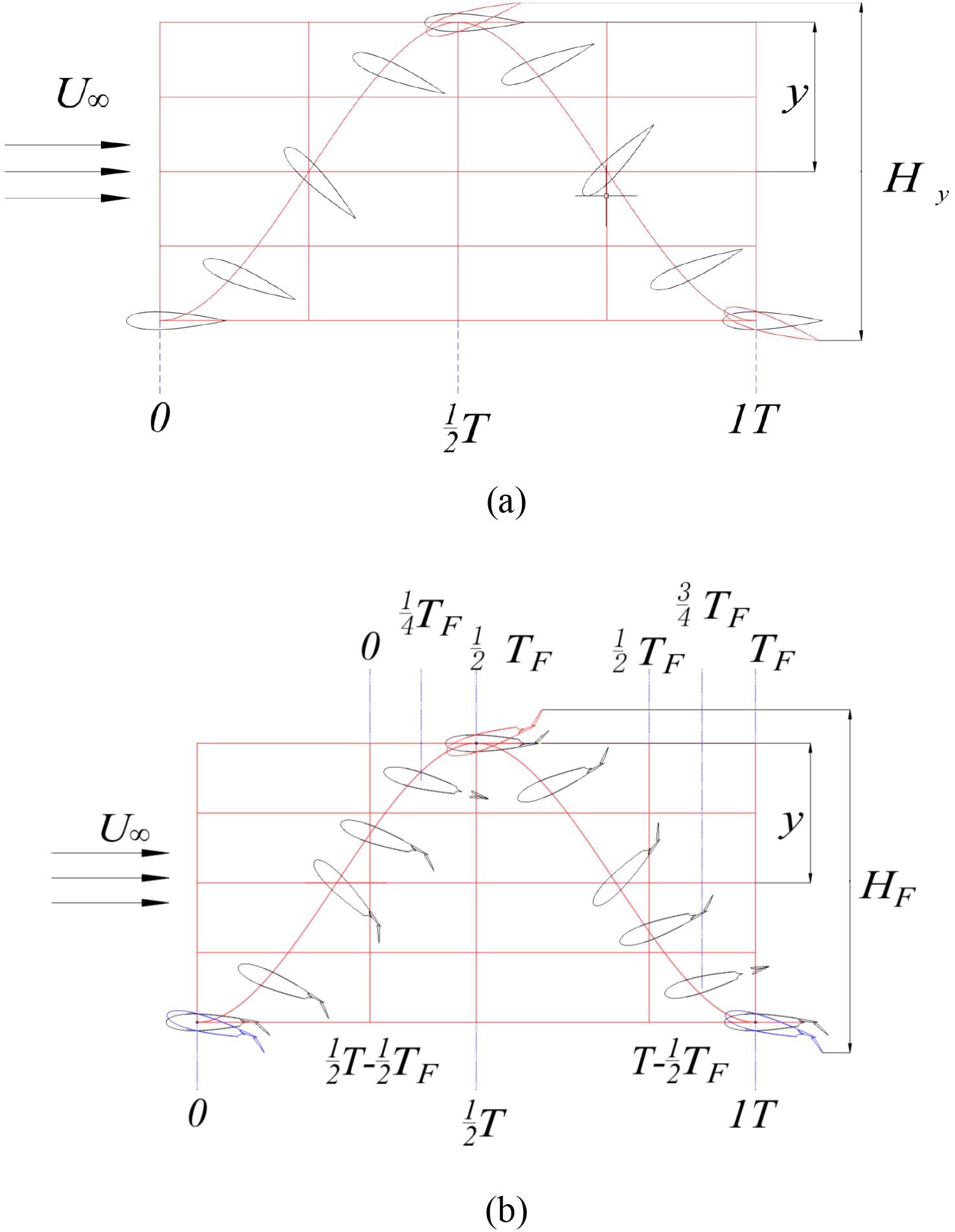 Figure 6 shows the comparison of sweep height between conventional hydrofoil and Fowler flap hydrofoil. It can be seen intuitively from the Figure 6. that the sweeping height of Fowler flap hydrofoil is higher than that of conventional hydrofoil. H is the sweep height of the convational oscillating hydrofoil, and HF is the sweep height of the oscillating hydrofoil with Fowler flaps. The equation is as follows:
