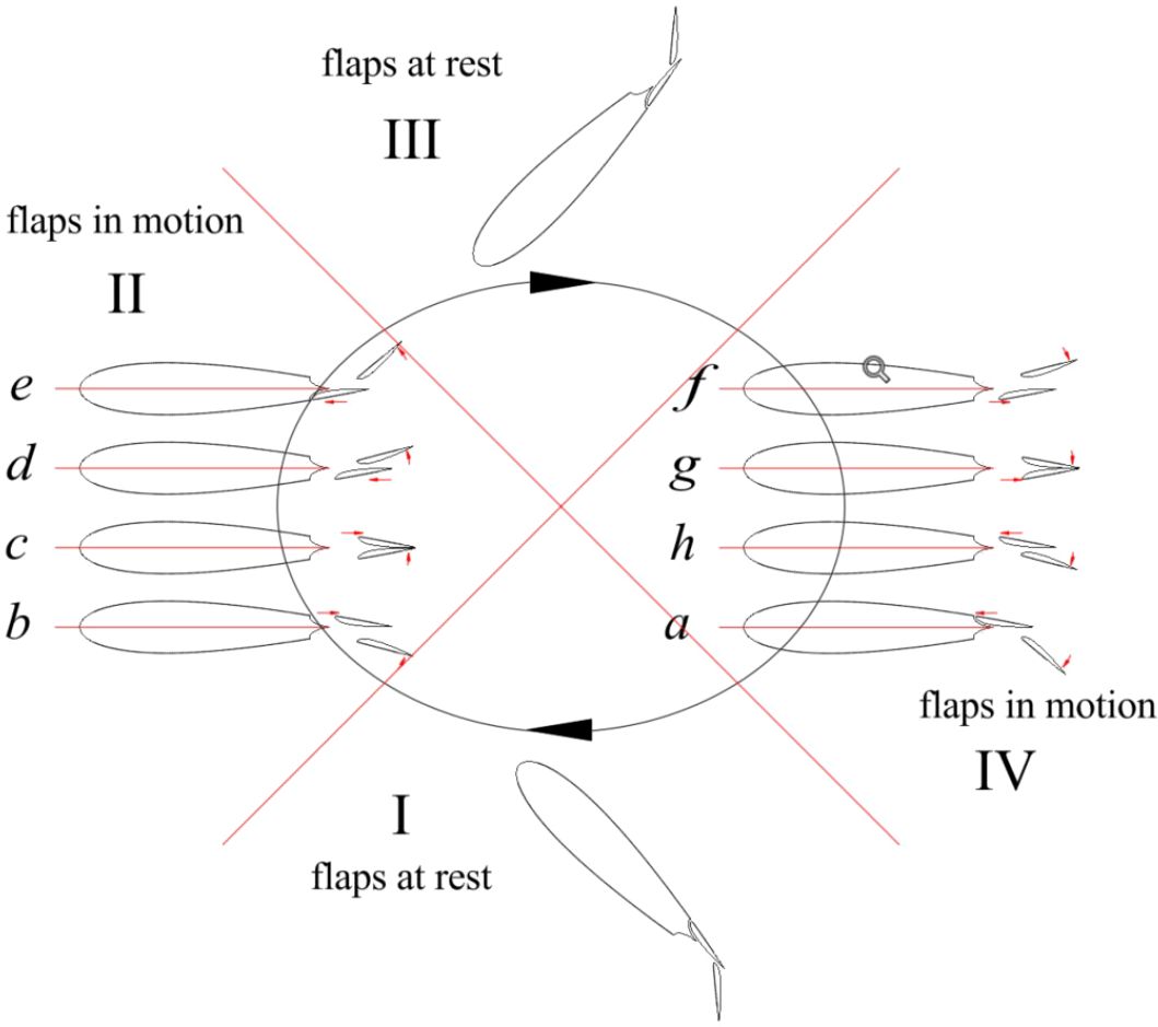 1. (0~(1/2T-1/2TF)), the main wing moves up and rotates counterclockwise, the Fowler flap remains stationary relative to the main wing;