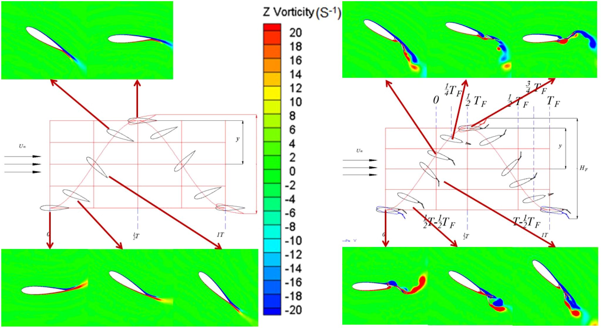 The effective angle of attack has a positive relation with the pitching angle. The effective angle of attack is expressed as the combination of the plunging induced and pitching angles (Kinsey and Dumas, 2012; Ma et al., 2017), which can be expressed as follows: