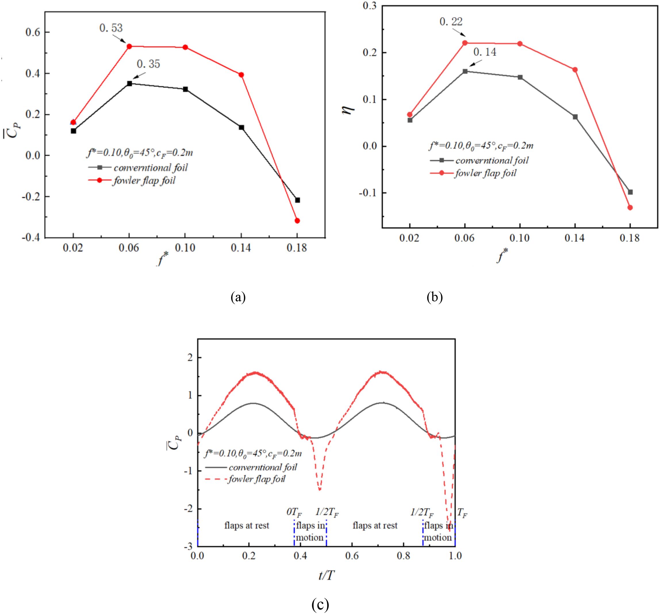 As can be seen in Figure 12a, The maximum power coefficient of the Fowler flap oscillating hydrofoil is 53%, which is 50% higher than that of traditional hydrofoils. Figure 12a shows that the power curve of Fowler flap is higher than that of conventional flap. Figure 12b shows that the structure of the Fowler flap increases the energy capture efficiency from 14% to 22%. In the movement period of the flap, the absolute value of the negative work of the Fowler flap also increases. In the movement process of the Fowler flap, it pays more negative work than the conventional hydrofoil. Due to the increase of lift coefficient, the overall power is still increased. These changes are reflected in Figure 12c, which shows the trend of power variation during this cycle.