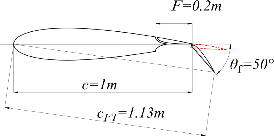 In the unfolded structure of hydrofoils, different geometric parameters of Fuller flaps will produce different hydrofoil structures. As shown in Figure 3, this paper selects a parameter combination as the research condition: the translational motion distance of the flaps, F=0.2m, the rotation angle of the flaps, θf =50°, and the chord length of the hydrofoil in this state, cFT 1.13m.
