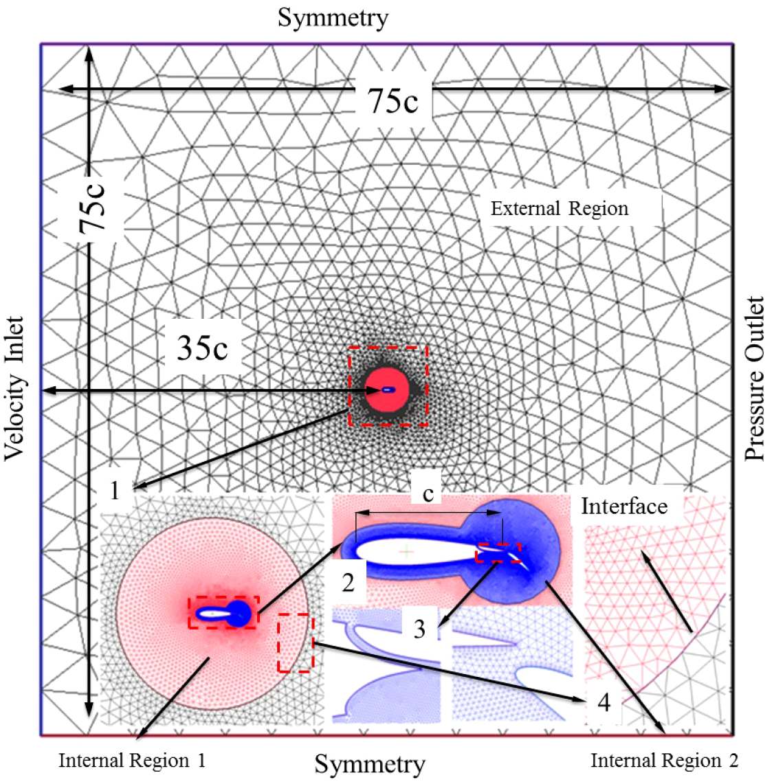 Grid detail and boundary conditions (NACA0018 foil, total cells: 0.9×105,700 nodes on the foil).