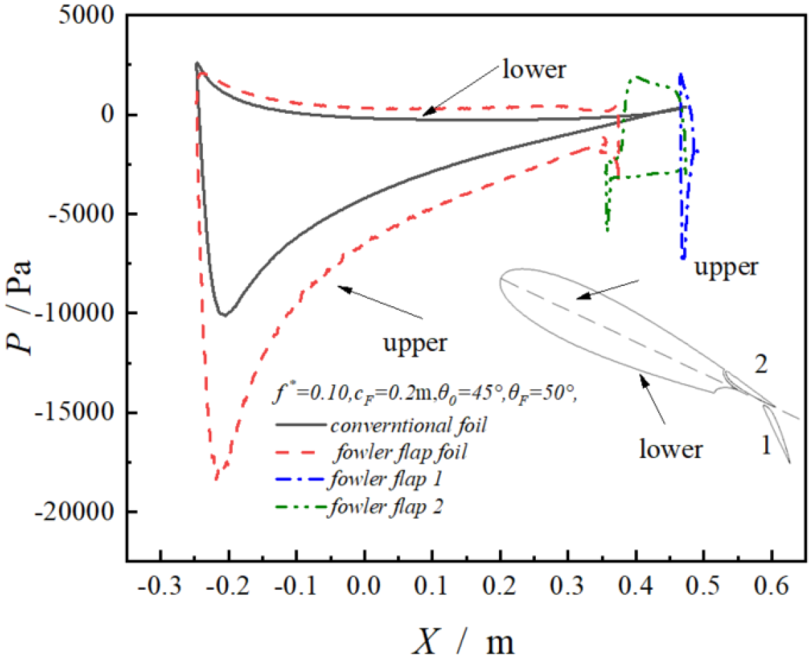 In Figure 8, this paper compares the external flow field of traditional hydrofoil and Fowler flap hydrofoil. At 0.25T, the attack angle of both hydrofoils is 45°. It can be seen that Fowler flap structure increases the camber of the overall hydrofoil and extends in the chord length direction. These two factors greatly change the stress condition of hydrofoil. The pressure on the lower surface of Fowler flap hydrofoil is higher than that of conventional hydrofoil, and the negative pressure on the upper surface of Fowler flap hydrofoil is also lower than that of conventional hydrofoil. The pressure difference between the two is the lift exerted on the hydrofoil. The greater the pressure difference, the greater the lift exerted on the hydrofoil.