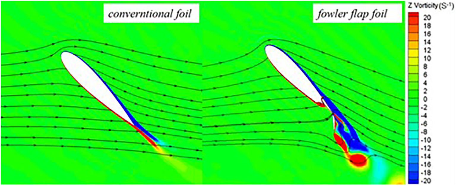 The vortex intensity of Fowler flap hydrofoil is higher than that of conventional hydrofoil. As can be seen from Figures 10, 11, there is almost no vortex shedding on conventional hydrofoils, but vortex shedding occurs on Fowler flap hydrofoils. The reason for the vortex is that the flap structure increases the angle of attack of the original hydrofoil and the chord length of the overall hydrofoil. It can be seen that although Fowler flap structure increases the lift of the overall hydrofoil, it will also produce some bad effects, such as vortices and increased drag. This effect is not expected to be achieved by the structure, and can be optimized on the airfoil of the Fowler flap in the future to achieve the Fowler flap airfoil with the minimum drag and vortex.
