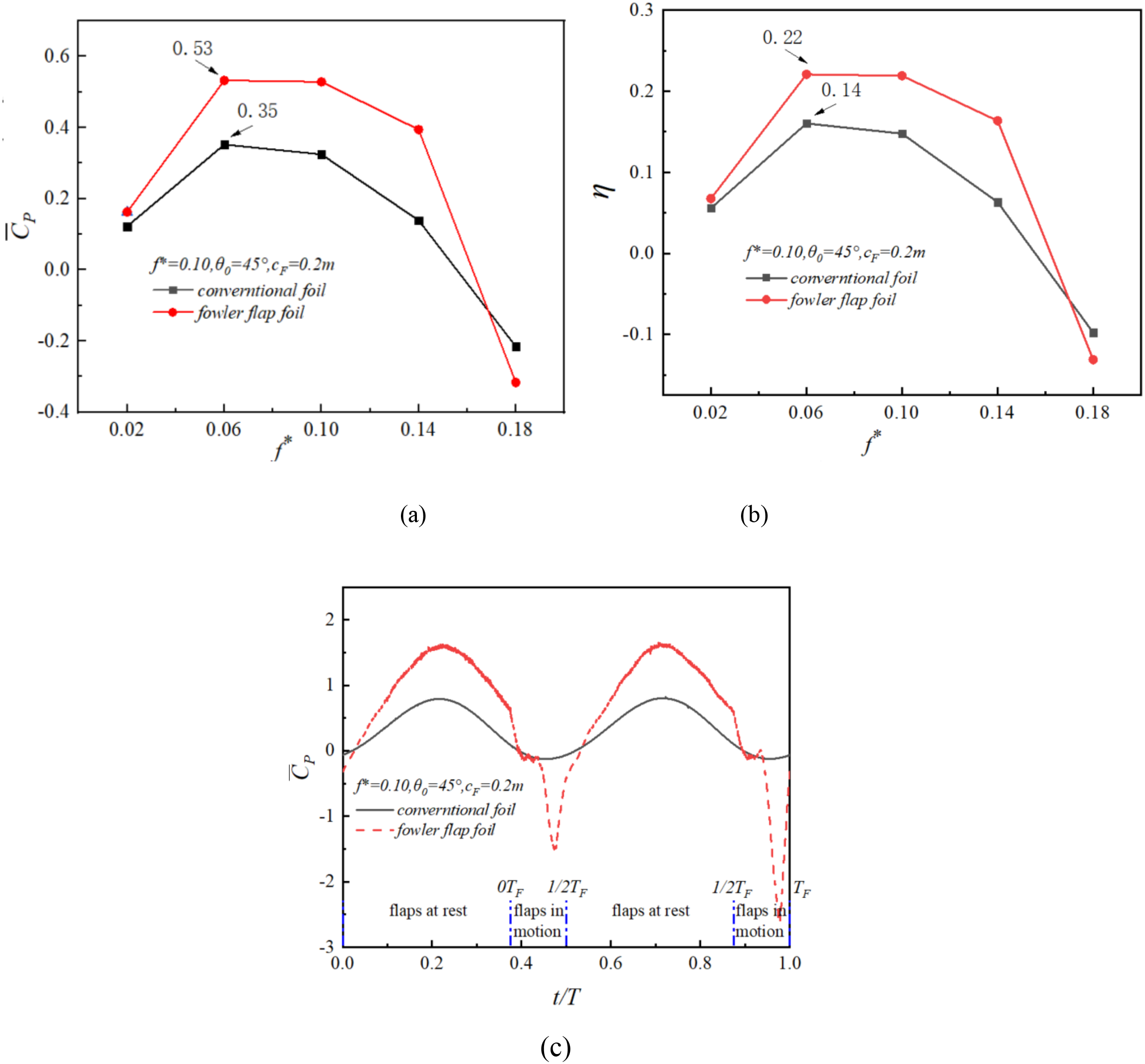 (a–c) Change of power coefficient of Fowler flap oscillating hydrofoil.