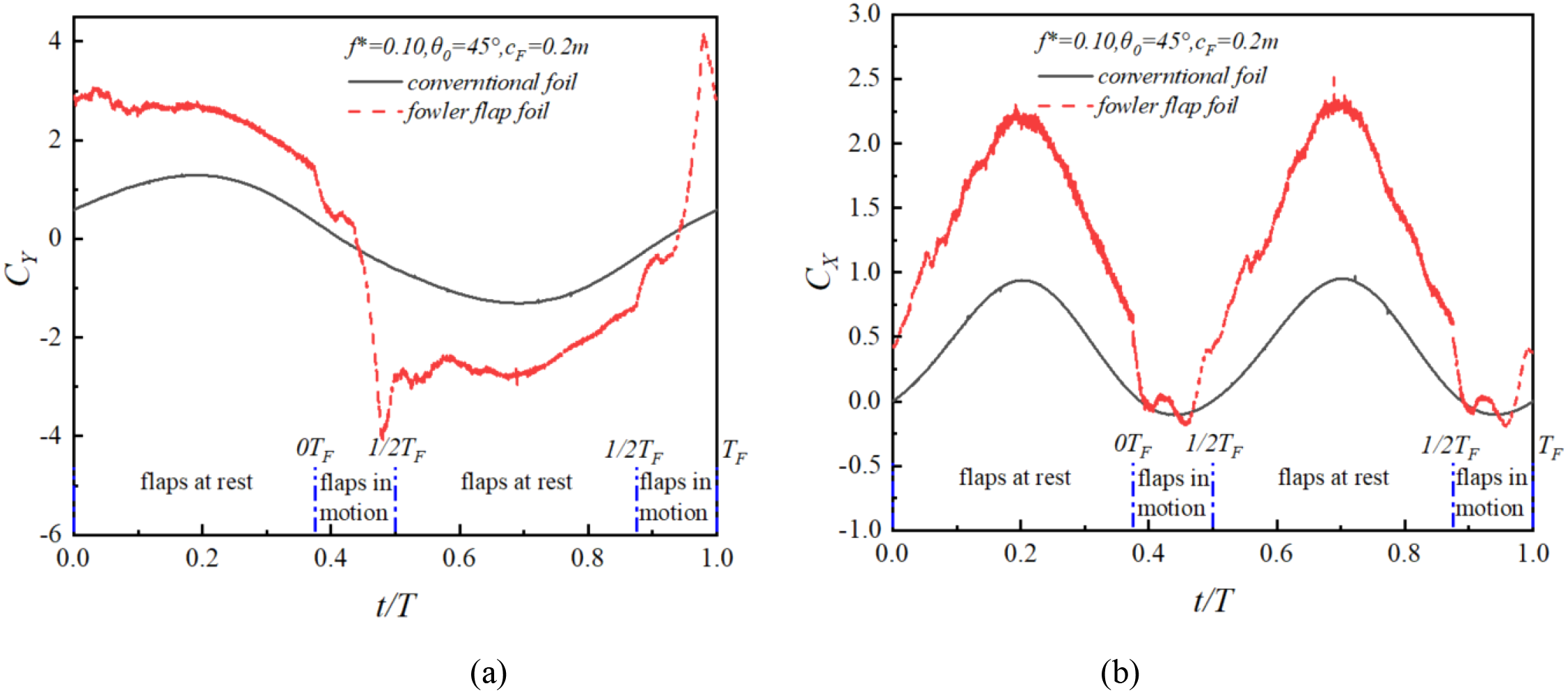 (a, b) Variation of hydrodynamic coefficient of Fowler flap oscillating hydrofoil in one cycle.