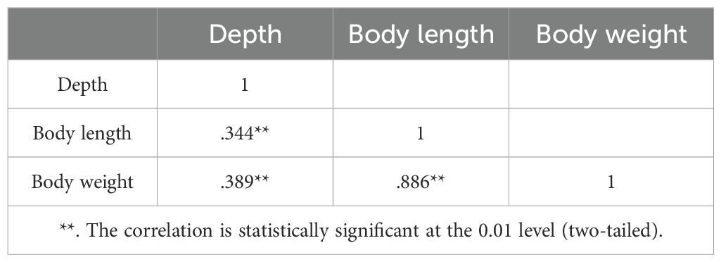 The results of the Pearson correlation analysis revealed a significant positive correlation between the body length, body weight, and fishing depth of P. arenatus (Table 2). Clearly, the transition in habitat preference occurred when individuals reached a body length of 60 mm (Figure 3).