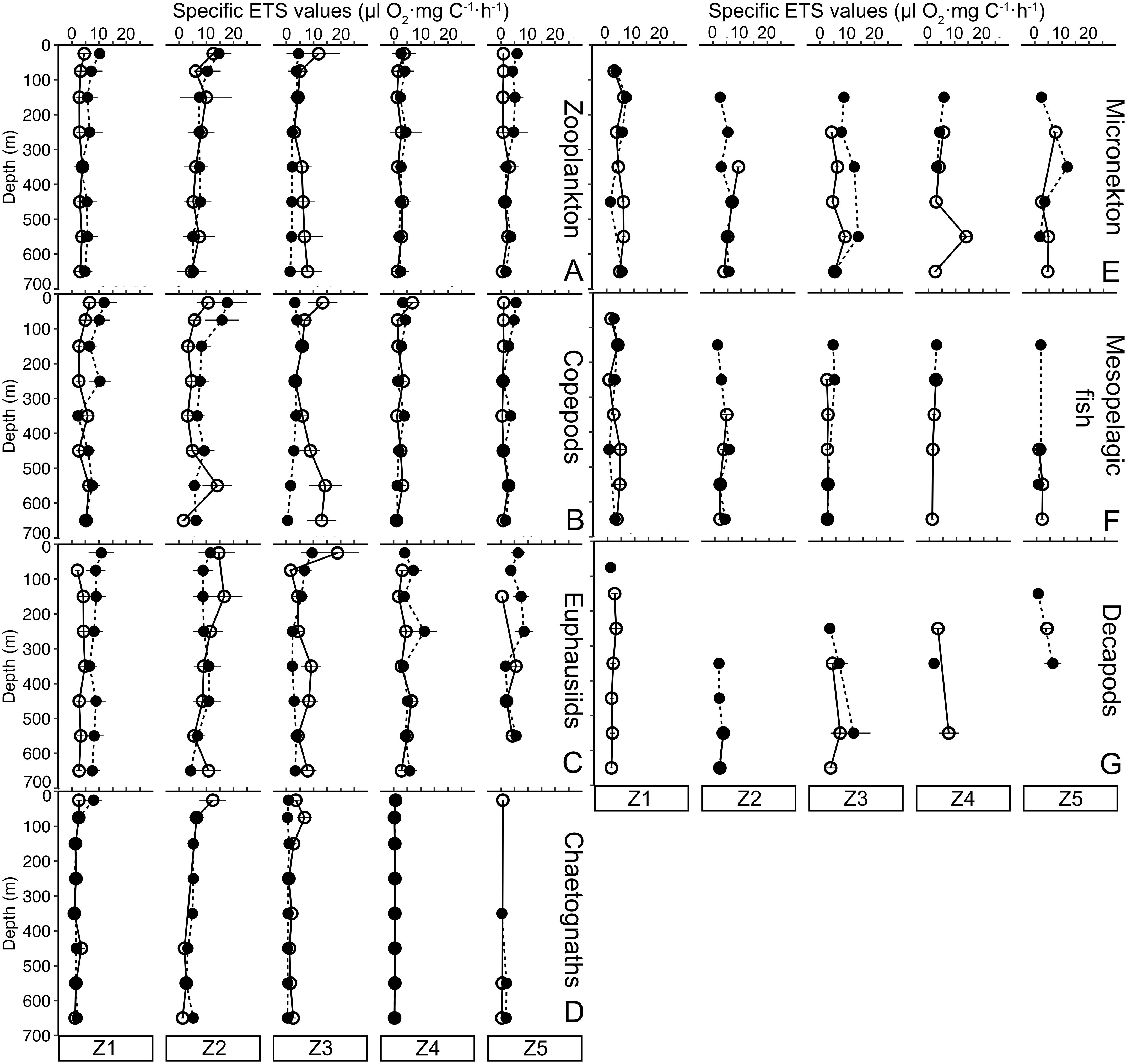 Depth profiles of specific ETS values for various marine organisms: Zooplankton, copepods, euphausiids, chaetognaths, micronekton, mesopelagic fish, and decapods. Each panel (A to G) shows specific ETS values in microliters of oxygen per milligram of carbon per hour, plotted against depth in meters. Black filled circles and open black circles represent the data points, indicating variations across different zones (Z1 to Z5).