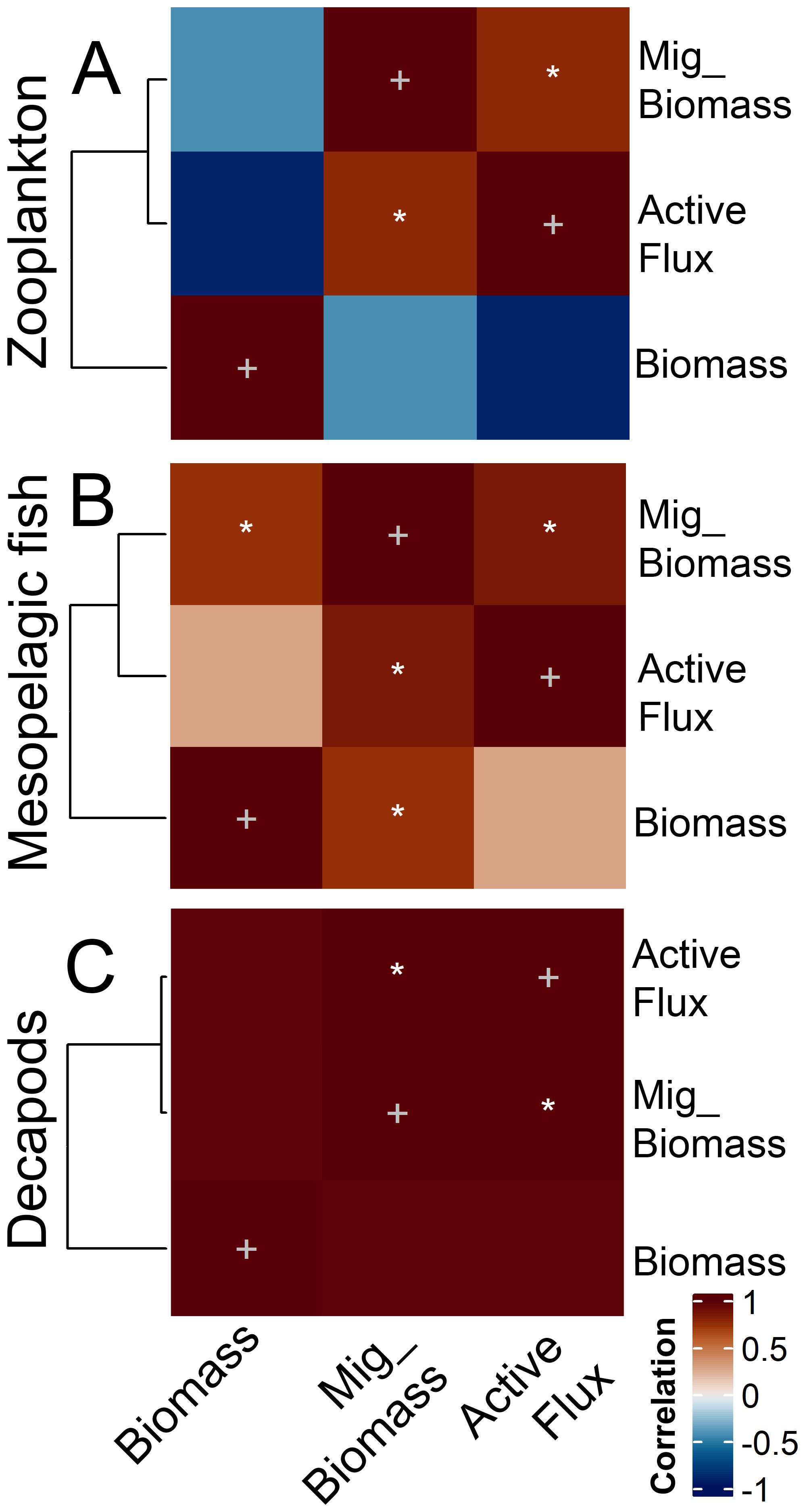 Heatmap displaying correlation matrices for three groups: zooplankton (A), mesopelagic fish (B), and decapods (C). Variables include biomass, migratory biomass (Mig_Biomass), and active flux. Color scale ranges from dark blue (negative correlation) to dark red (positive correlation). Plus and asterisk symbols indicate varying levels of statistical significance within the matrices.