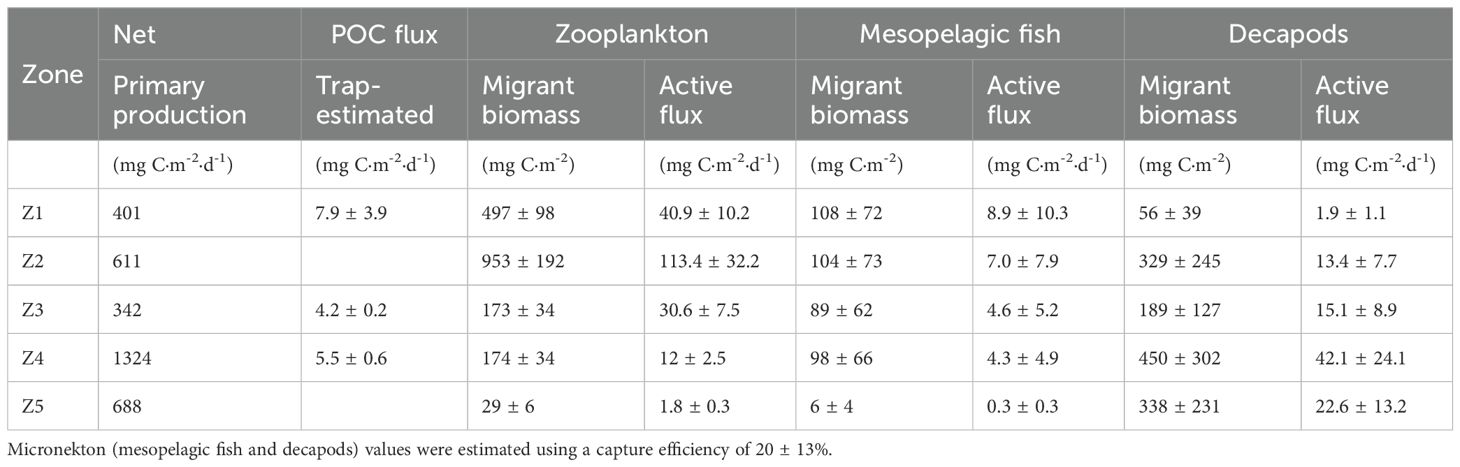 Table 1. Net primary production (0–200 m depth), passive organic carbon (POC) flux measured at 150 m depth, zooplankton, mesopelagic fish, and decapods migrant biomass (± sensitivity analysis error) and active flux (± sensitivity analysis error) from epipelagic layer (0–200 m depth) to mesopelagic layer (200–700 m depth).