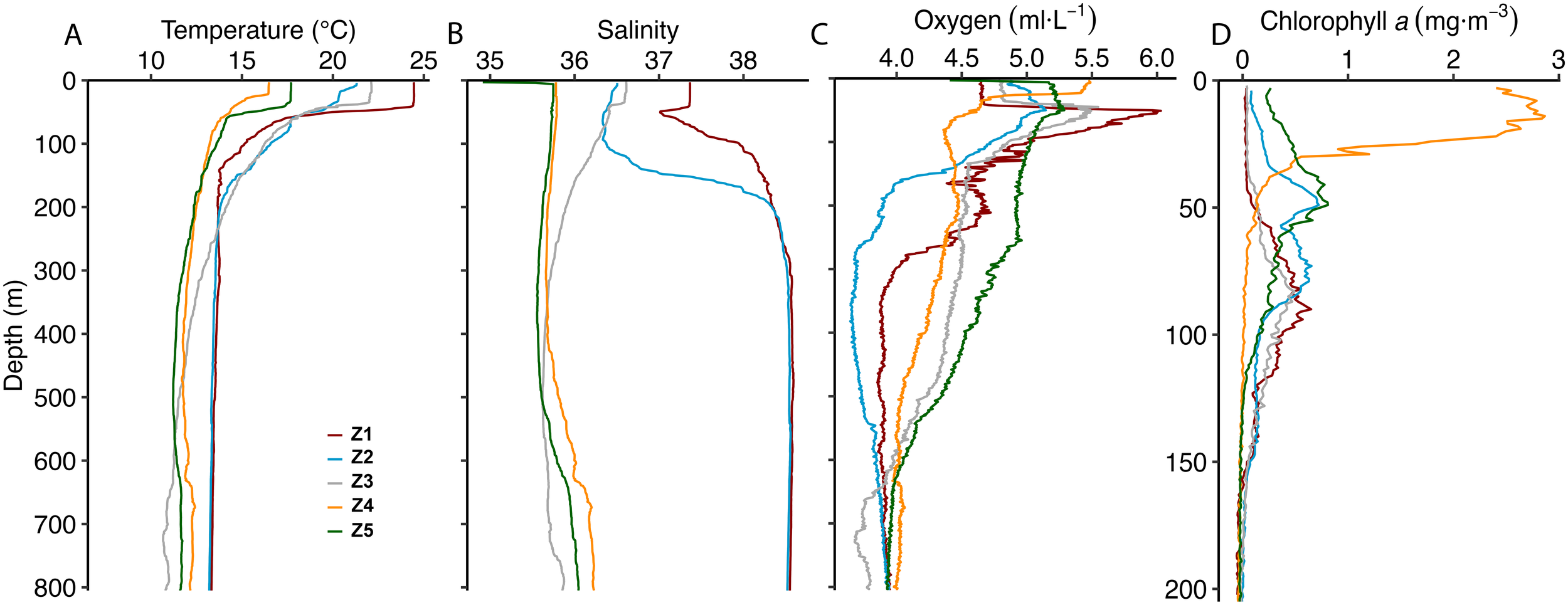 Vertical profiles of (A) temperature (°C), (B) salinity, (C) mL·L-1 and (D) chlorophyll a (mg·m-3) at Z1 (red), Z2 (blue), Z3 (purple), Z4 (orange), and Z5 (green). Note the different y-axis scale for chlorophyll a.