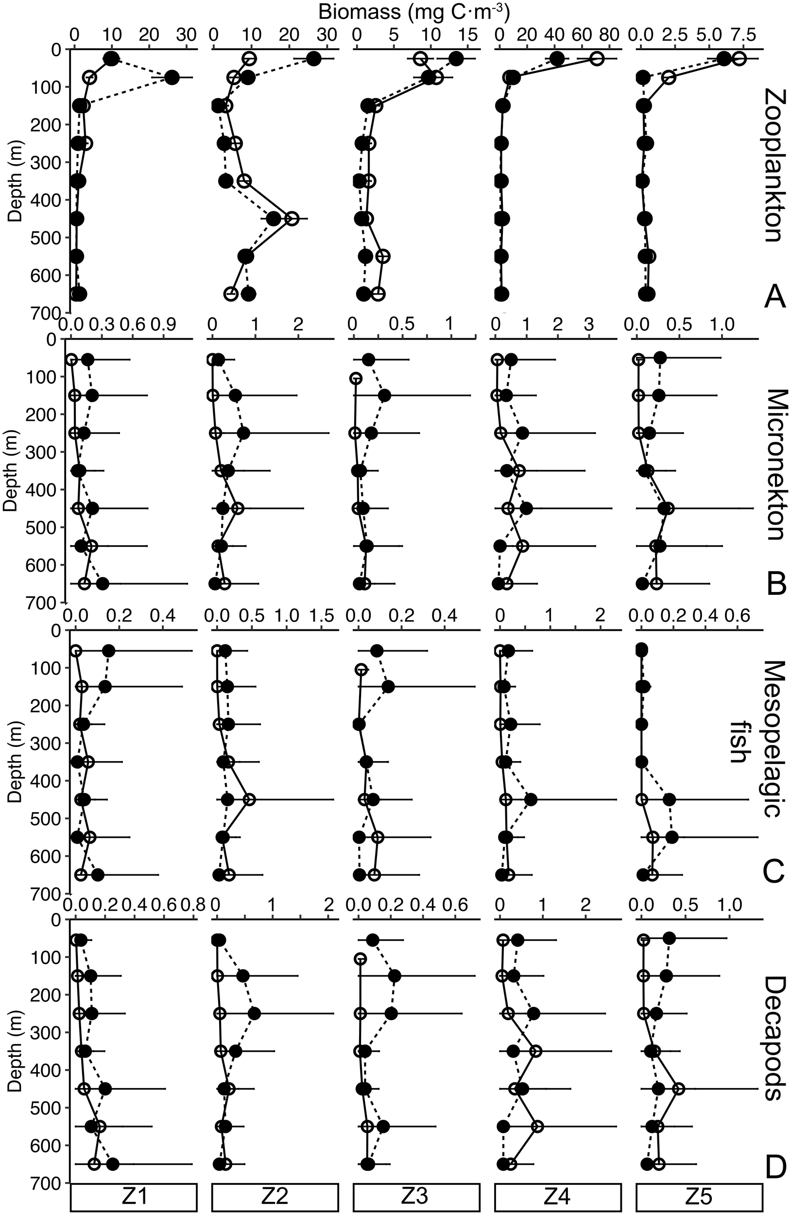 Biomass (mg C·m-3) vertical distribution (0–700 m depth) of (A) zooplankton, (B) micronekton (mesopelagic fish and decapods), (C) mesopelagic fish, and (D) decapods during day (empty dots) and night (black dots) at the different zones. Note different x-axis scale for each station. Black lines stand for the sensitive analysis error.