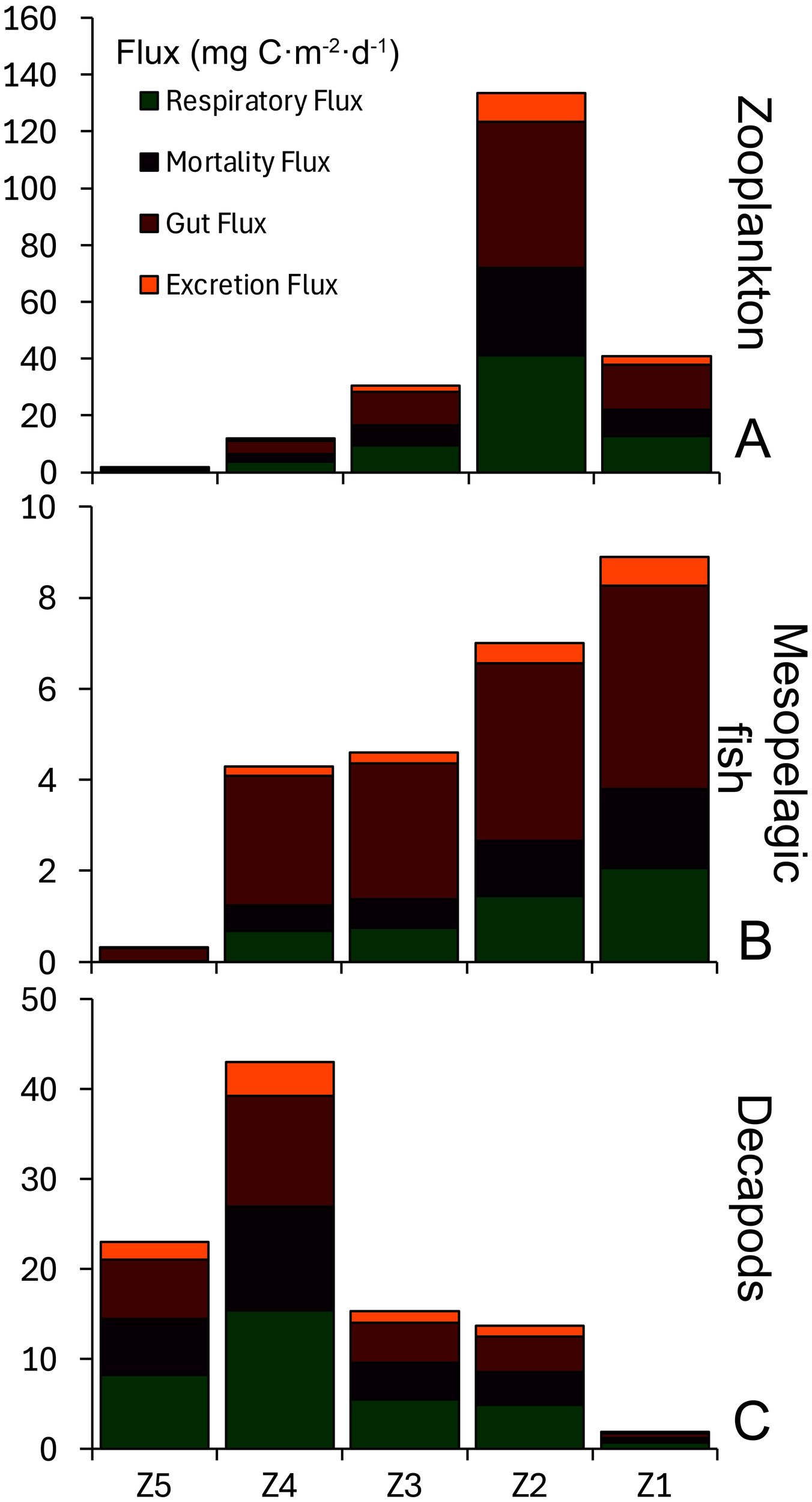 Respiratory (in green), mortality (in purple), gut (in dark red), and excretion (in orange) fluxes (mg C·m-2·d-1) of (A) zooplankton, (B) mesopelagic fish, and (C) decapods.