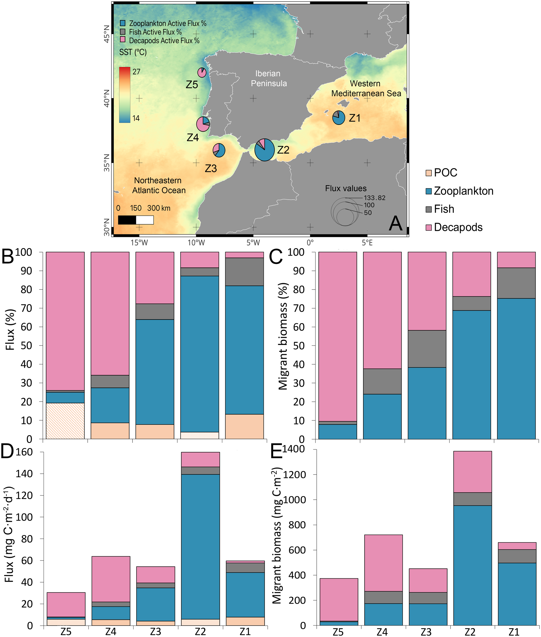 (A) Study zones sampled during the CSIC-SUMMER cruise, with background colors representing sea surface temperature (SST, °C) in October 2020. Zone 1 (Z1) corresponds to the south of the Balearic Islands, Zone 2 (Z2) to the western Alborán Sea, Zone 3 (Z3) to the Gulf of Cadiz, Zone 4 (Z4) off Lisbon, and zone 5 (Z5) off Galicia. Bubble size indicates total active flux (zooplankton + micronekton), with blue for zooplankton, grey for fish, and pink for decapods. (B) Percentage contribution to the biological carbon pump by passive flux (light orange), zooplankton (blue), and micronekton (purple; fish + decapods). For Z5 and Z2, we do not have direct passive flux measurements, so we applied the average value from Z1, Z3 and Z4 (shaded orange). (C) Percentage distribution of migrant biomass among zooplankton, fish, and decapods. (D) Carbon fluxes (mg C·m-2·d-1). (E) Migrant biomass values (mg C·m-2).