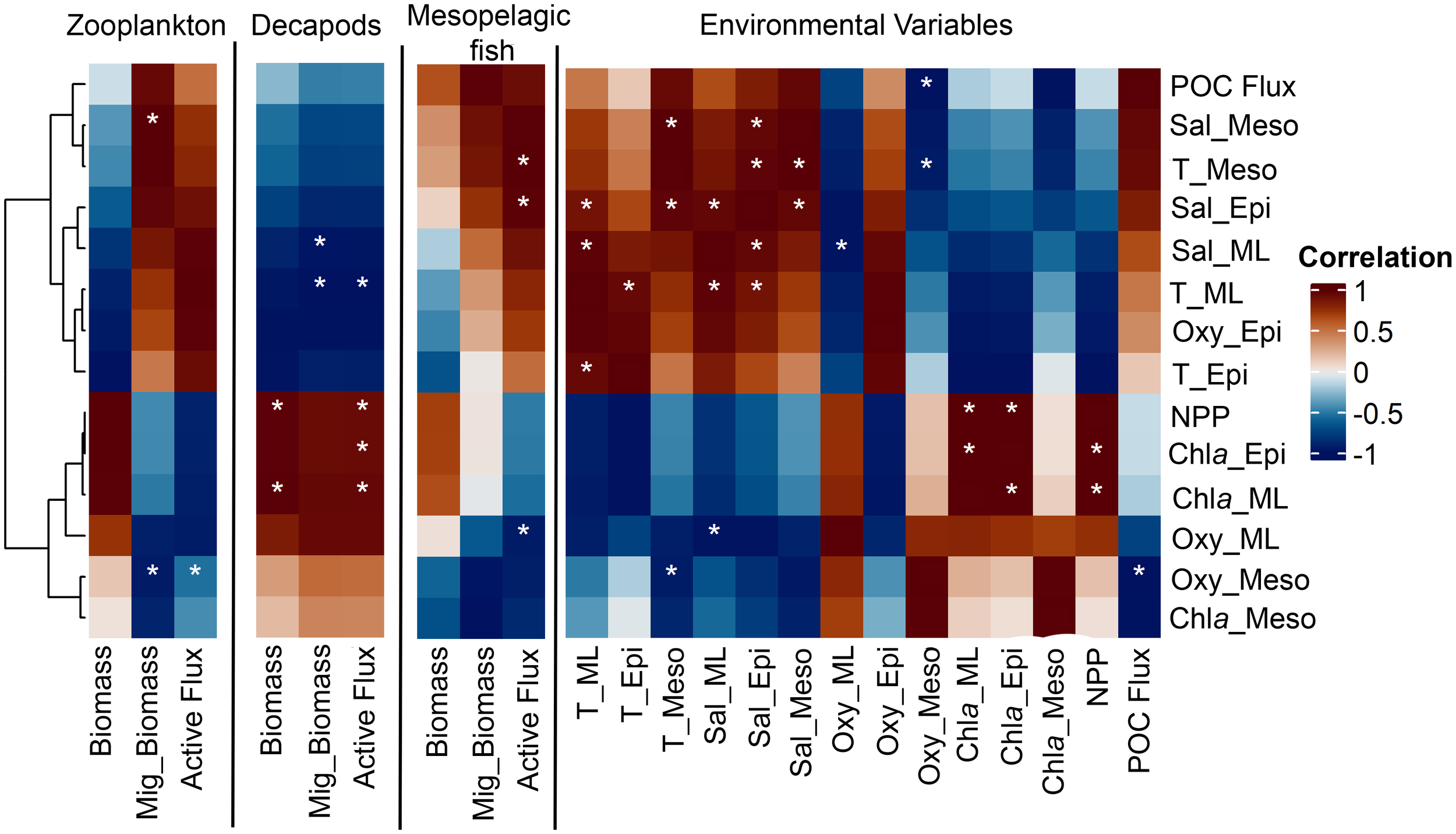 Results of the correlation analysis between the (A) zooplankton, (B) mesopelagic fish, and (C) decapods biomass, migrant biomass (Mig_Biomass), and active flux with the environmental variables. T stands for temperature, Sal for salinity, Oxy for oxygen, ML for the Mixed Layer (0–50 m), Epi for epipelagic (0–200 m), and Meso for mesopelagic (200–700 m). White stars indicate significant (p<0.05) linear regressions, while grey crosses indicate autocorrelation of the same variable. R2 for all significant relationships are > 0.78. * stand for significant correlations.