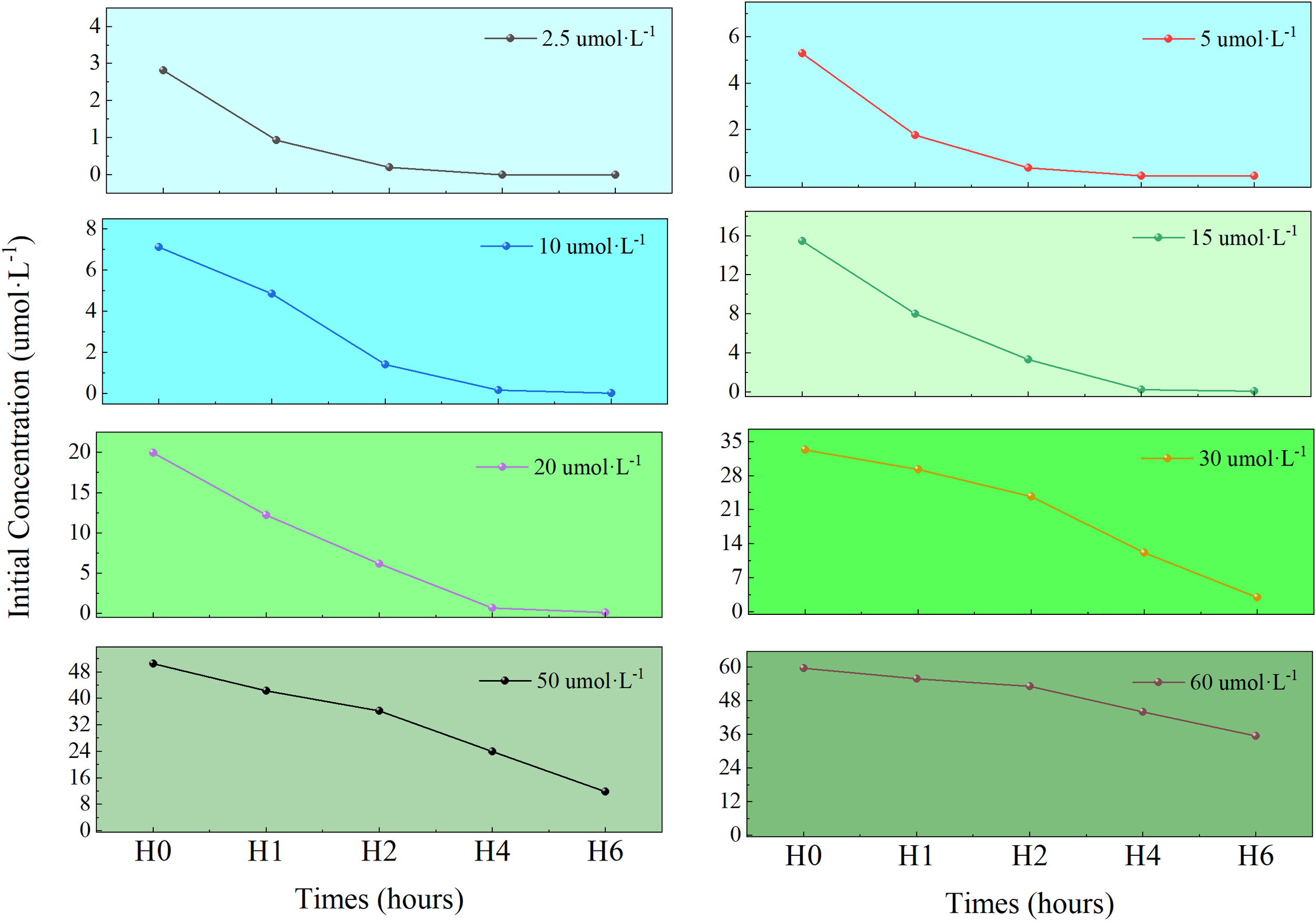 Time-dependent absorption rates (μmol·g⁻¹·h⁻¹) are shown in Figure 4. In 0–1 h, all groups except 130 μmol·L⁻¹ reached peak absorption rates, and absorption suppression occurred in high-concentration groups (≥110 μμmol·L⁻¹) (Figure 4a). In 2–4 and 4–6 h, rates dropped to 0 μmol·g⁻¹·h⁻¹ in low-concentration groups (5-30 μmol·L⁻¹) due to substrate exhaustion (Figures 4c, d). Final NO3⁻-N removal efficiencies (%) per group (5-130 μmol·L⁻¹) were: 31%, 100%,100%, 100%, 100%, 100%, 87% and 77%. It is worth noting that the NO3⁻-N removal rate in the lowest concentration group (5 μmol·L⁻¹) did not reach 100%, which indicates that in addition to the high concentration inhibition of NO3⁻-N absorption by U. prolifera, there may also be a low concentration absorption threshold.