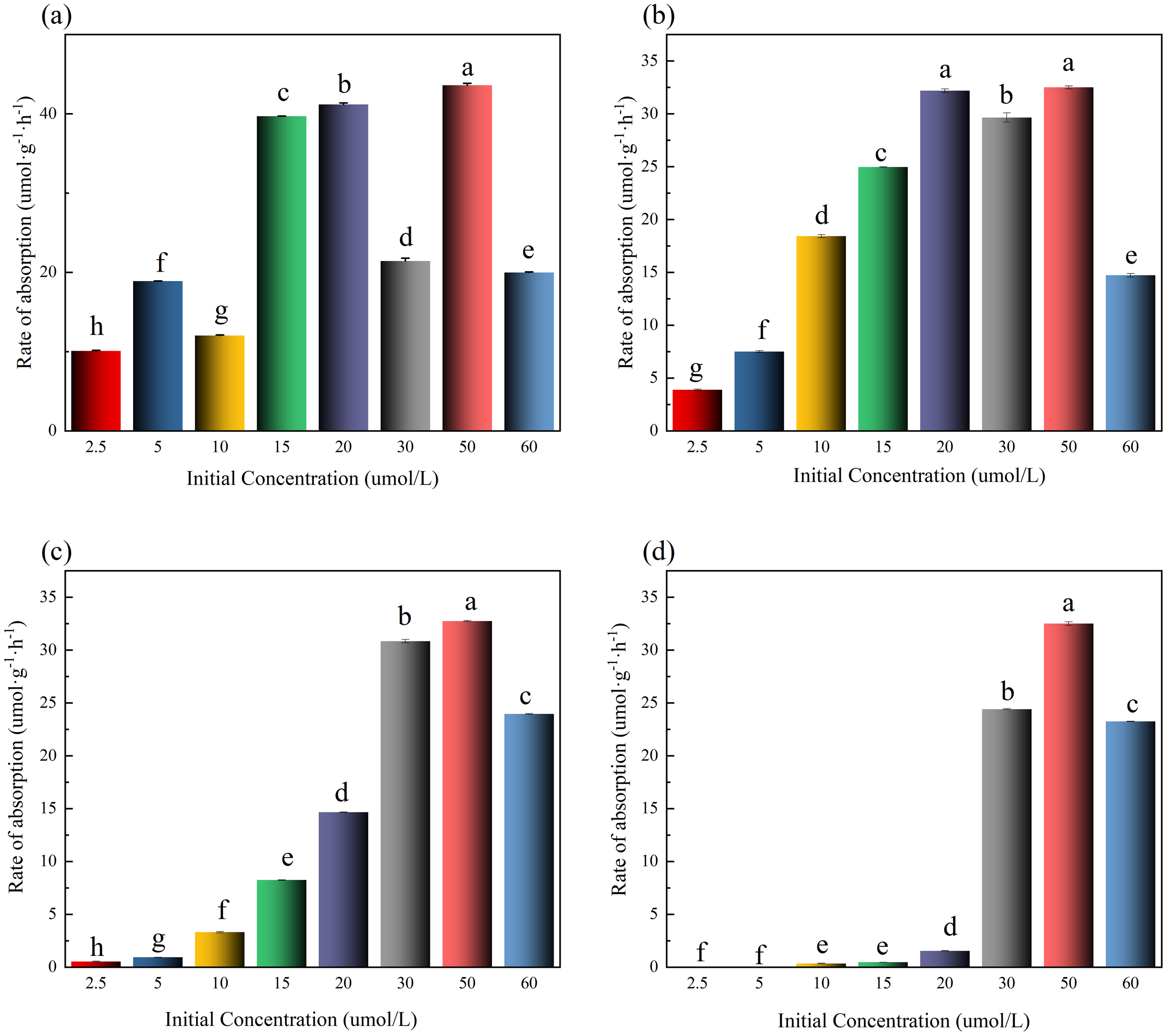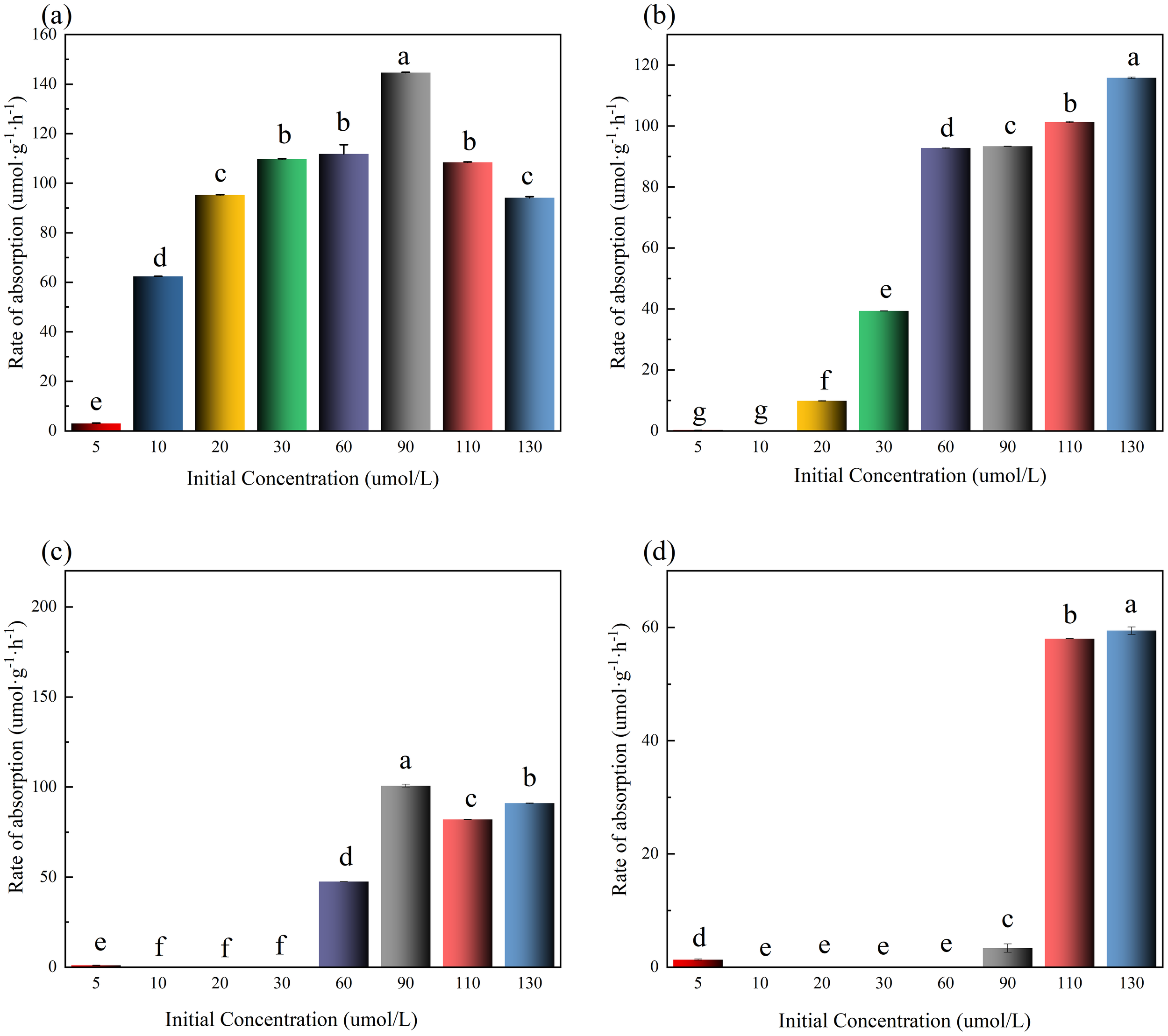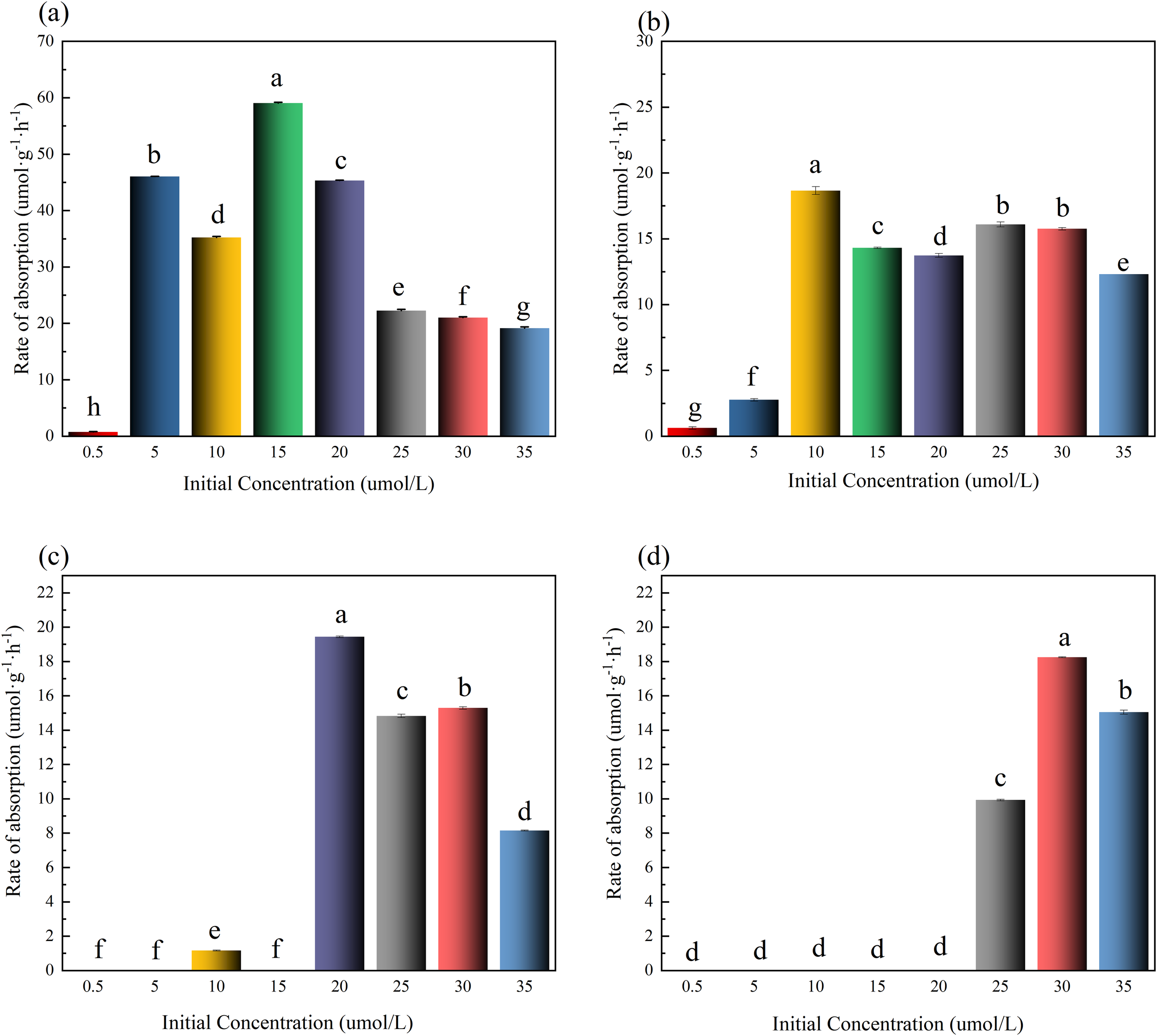 Rate of absorption in different initial concentrations of NO3⁻-N in medium. The lowercase letters denote statistically significant differences between groups at P < 0.05 based on Tukey's honestly significant difference (HSD) post hoc test. Groups sharing the same letter indicate no significant difference.