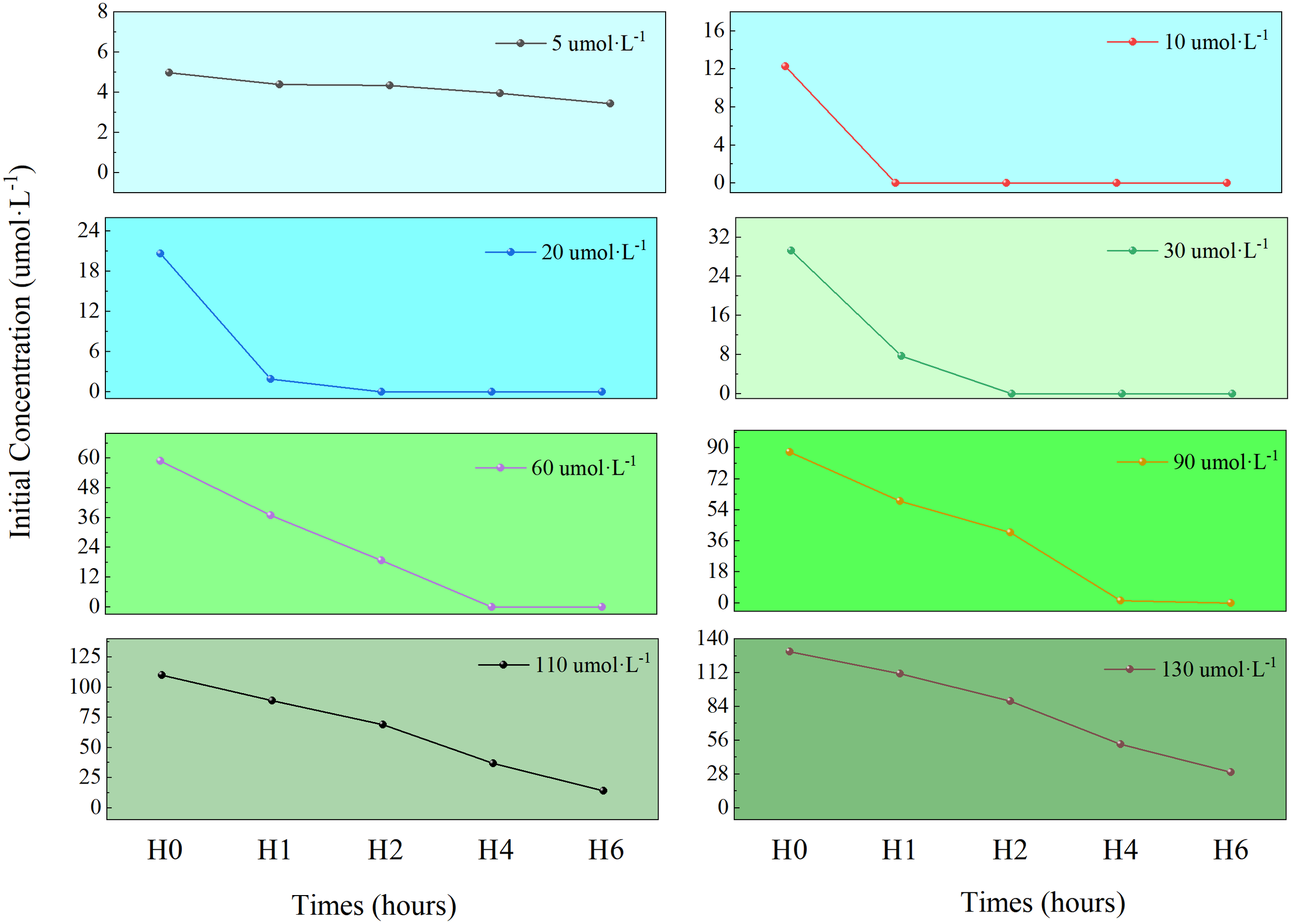 Changes in NO3⁻-N concentration within the culture media across treatment groups are shown in Figure 3. U. prolifera exhibited significant absorption capacity for nitrate nitrogen (NO3⁻-N). In low-concentration groups (5-30 μmol·L⁻¹), NO3⁻-N was almost completely depleted within 1–2 h. High-concentration groups (110-130 μmol·L⁻¹) showed gradual declines in NO3⁻-N concentration over time. After 6 h, the cumulative NO3⁻-N removal ranked as: 130 > 110 > 90 > 60 > 30 > 20 > 10 > 5 μmol·L⁻¹ groups, with the highest total removal in the 130 μmol·L⁻¹ group (100.25 μmol) followed by the 110 μmol/L group (96.15 μmol).