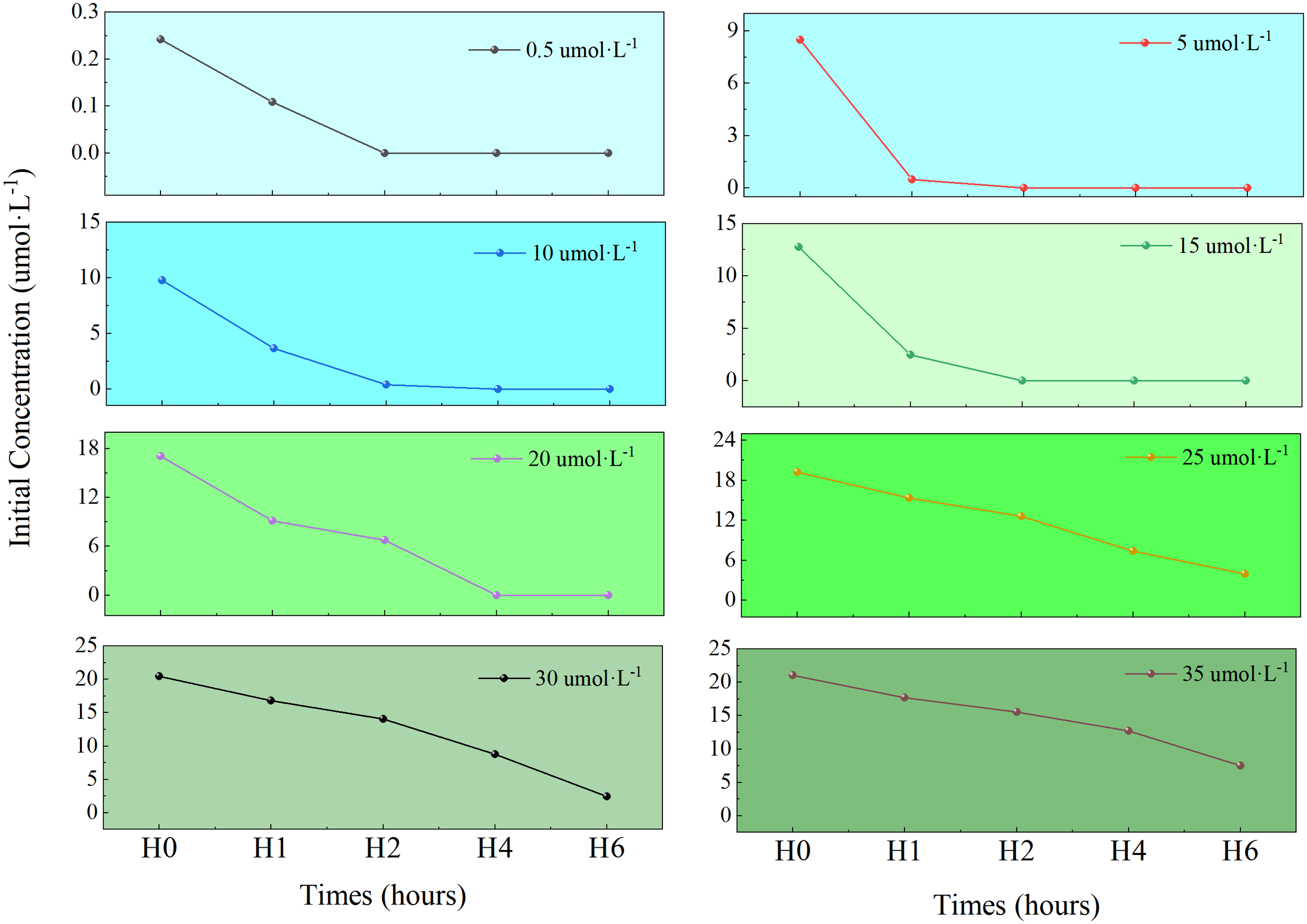 Changes in NH4+-N concentration within the culture media across treatment groups are shown in Figure 5. U. prolifera demonstrated significant assimilation capacity for ammonium nitrogen (NH4+-N). In low concentration groups (0.5-15 μmol·L⁻¹), NH4+-N was fully depleted within 2 h. High-concentration groups (20-35 μmol·L⁻¹) exhibited gradual concentration declines throughout the experiment. After 6 h, cumulative NH4+-N removal ranked per group (0.5-35 μmol·L⁻¹) as: 30 > 20 > 25 > 35 > 15 > 10 > 5 > 0.5 μmol·L⁻¹ groups, with maximum removal in the 30 μmol·L⁻¹ group (18.08 μmol) followed by the 20 μmol/L group (17.04 μmol).