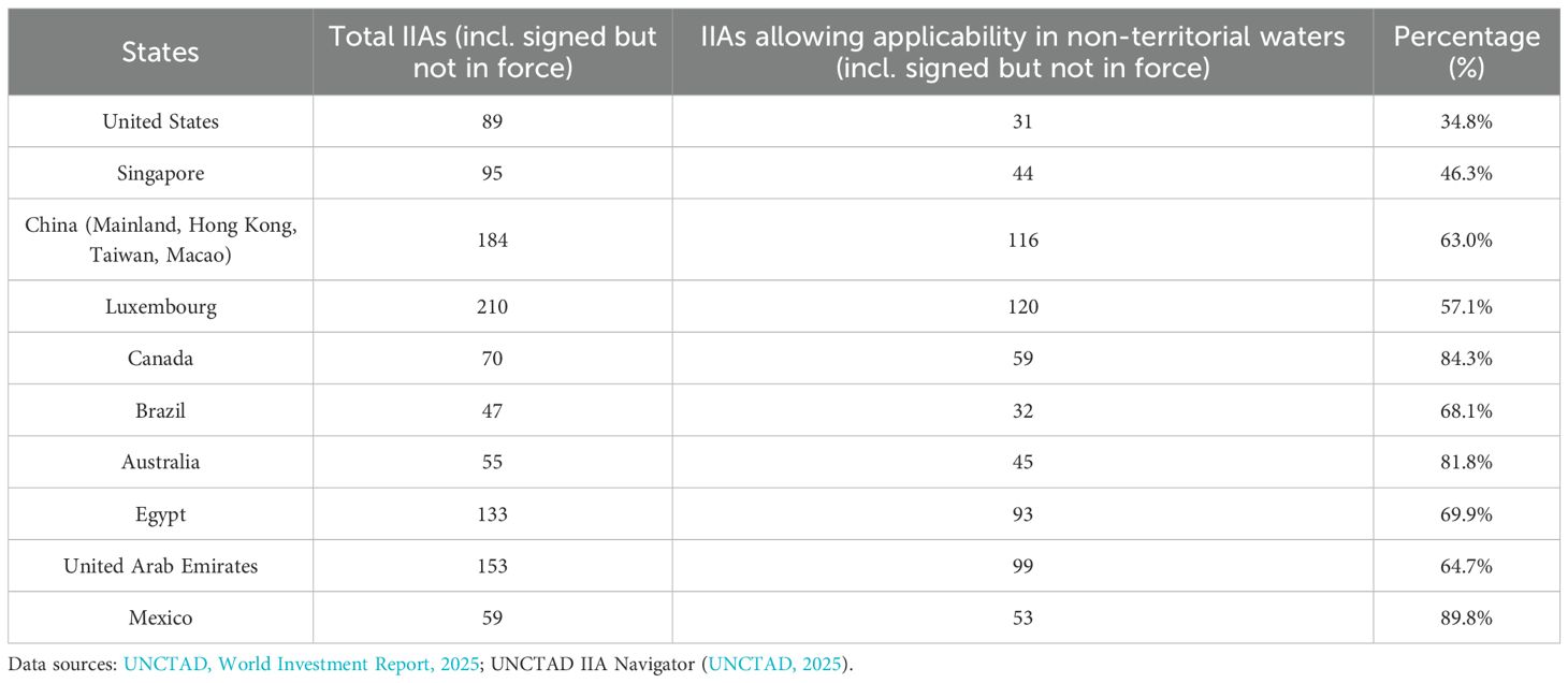 Expanding the geographic scope of IIAs through territorial clauses should be considered as the first step. Revising existing IIAs is the most direct approach, but it may not necessarily achieve the most ideal results. On the one hand, unilateral termination of IIAs may have significant adverse effects on international investment in the short term, as evidenced by India’s large-scale termination of IIAs in the past decade (Kotyrlo and Kalachyhin, 2023). On the other hand, negotiating new IIAs can be a time-consuming process. In the interim period before new IIAs are enacted, if existing ones have already been terminated, the sunset clauses of the terminated IIA can only provide protections for investments made before the date of treaty termination. As a result, if other provisions of an IIA adequately meet the practical needs of safeguarding maritime investments, States can also, in accordance with Article 31 of the Vienna Convention on the Law of Treaties, provide legally binding interpretations on the scope of the agreement through subsequent agreements or practices. Alternatively, during the arbitration process, States can also achieve the application of IIAs in non-territorial waters by responding to the arbitration tribunal’s invitation or submitting opinions on treaty interpretation to the tribunal in the capacity of a non-disputing party (Titi, 2017).