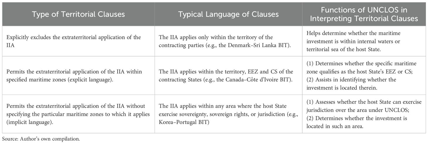 For the explicit and implicit territorial clauses of IIAs, their basic language and the role of UNCLOS in their interpretation are summarised and outlined in the table below (See Table 2).