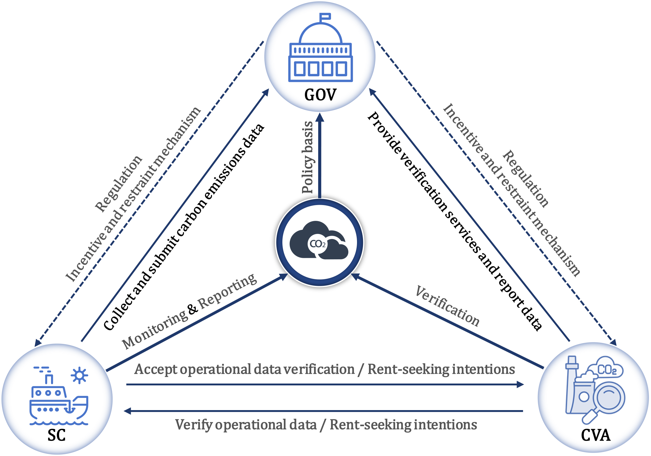 However, empirical evidence reveals strategic rent-seeking by some firms to evade environmental accountability (Haque and Islam, 2015; Luo, 2019). Concurrently, driven by economic incentives such as securing additional revenue, maintaining client relationships, and competitive pressures, carbon verification agencies (CVAs) may form strategic collusion with shipping companies (Pan et al., 2019). Compounded by potential loopholes or insufficient incentives within the regulatory environment, these factors collectively heighten the risk of systematic data inaccuracies and incentivize verifiers to deviate from their mandate of independent and objective verification. These principal-agent issues distort carbon pricing signals and trigger regulatory failures through adverse selection, ultimately eroding governance effectiveness and disrupting the regulatory framework (Wang et al., 2023). This demands an anti-rent-seeking collaborative governance framework to enable the industry’s effective low-carbon transition.