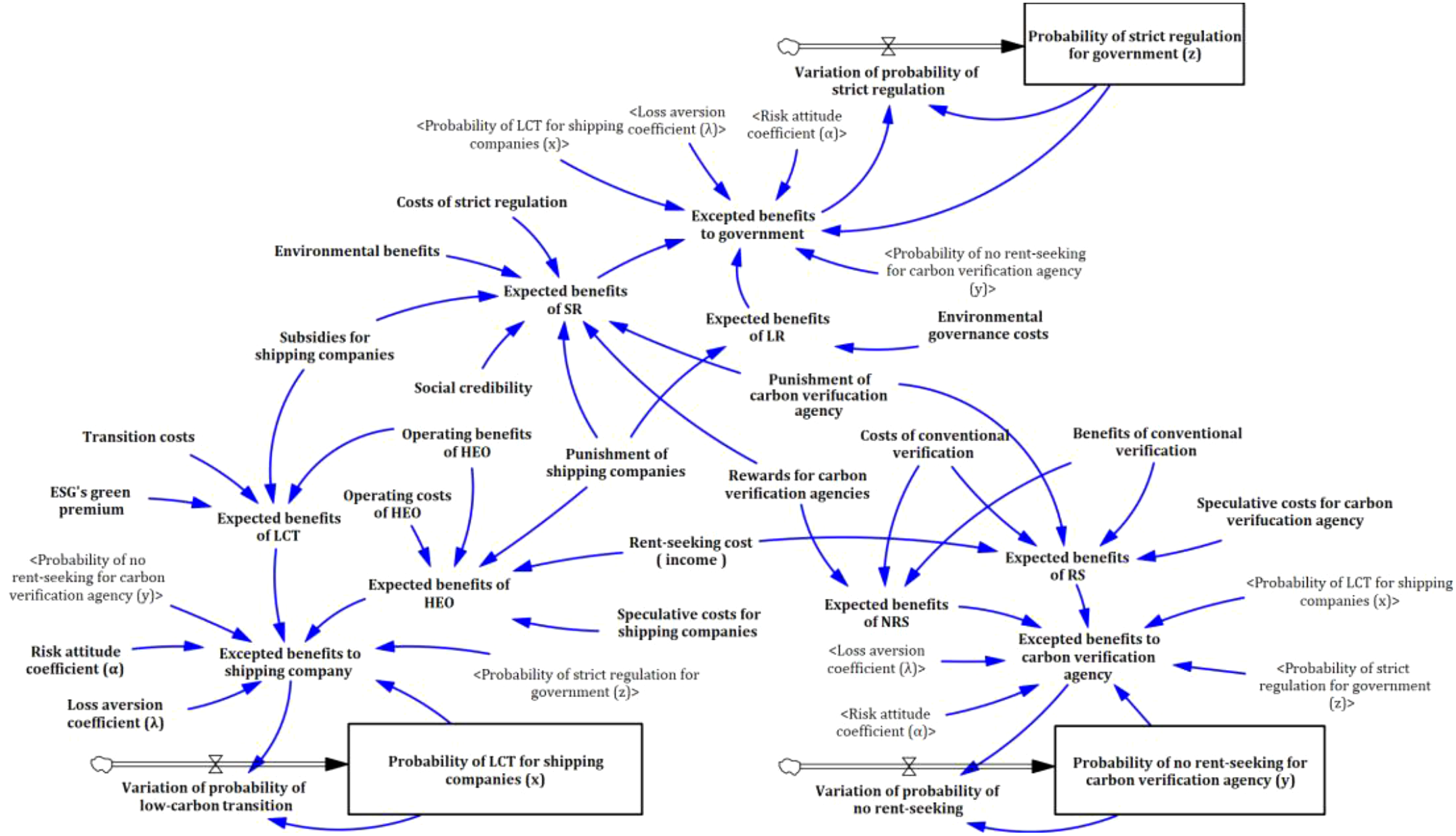 Prospect theory provides a robust framework for analyzing irrational decision-making (Githinji et al., 2023), demonstrating how actors asymmetrically perceive gains versus losses through dynamic reference point adjustments (Barberis, 2013). Complementarily, evolutionary game theory models multi-agent dynamic interactions by simulating long-term equilibrium selection among stakeholders (Brunetti et al., 2018). In shipping carbon governance, shipping companies and verification agencies, operating under risk-based cost-benefit structures, exhibit reference-dependent preferences that amplify strategic complexity (Ye et al., 2024). Integrating these theories enables precise modeling of stakeholder decision patterns and strategy evolution, thereby providing scientifically grounded insights for effective governance policies.