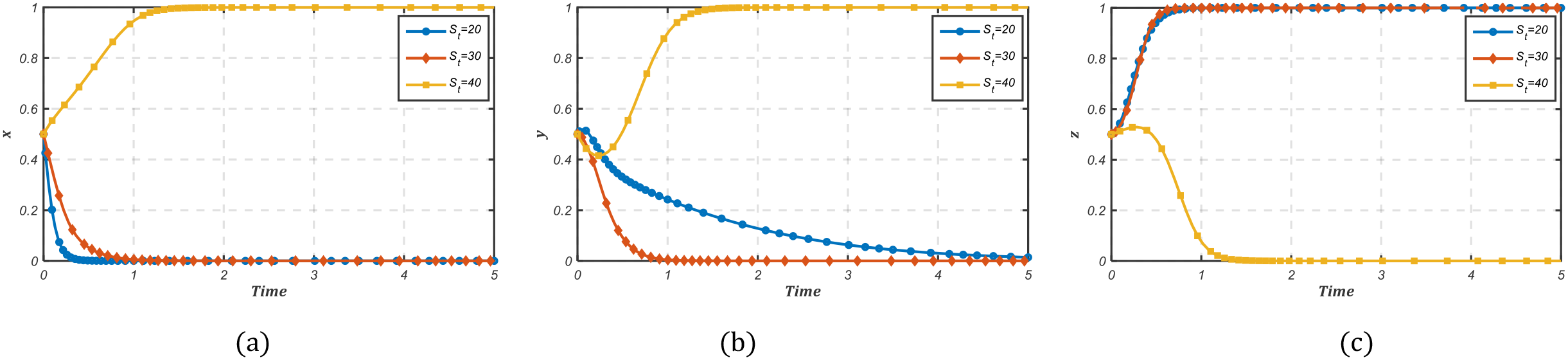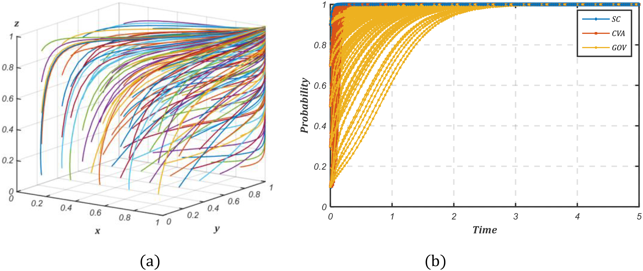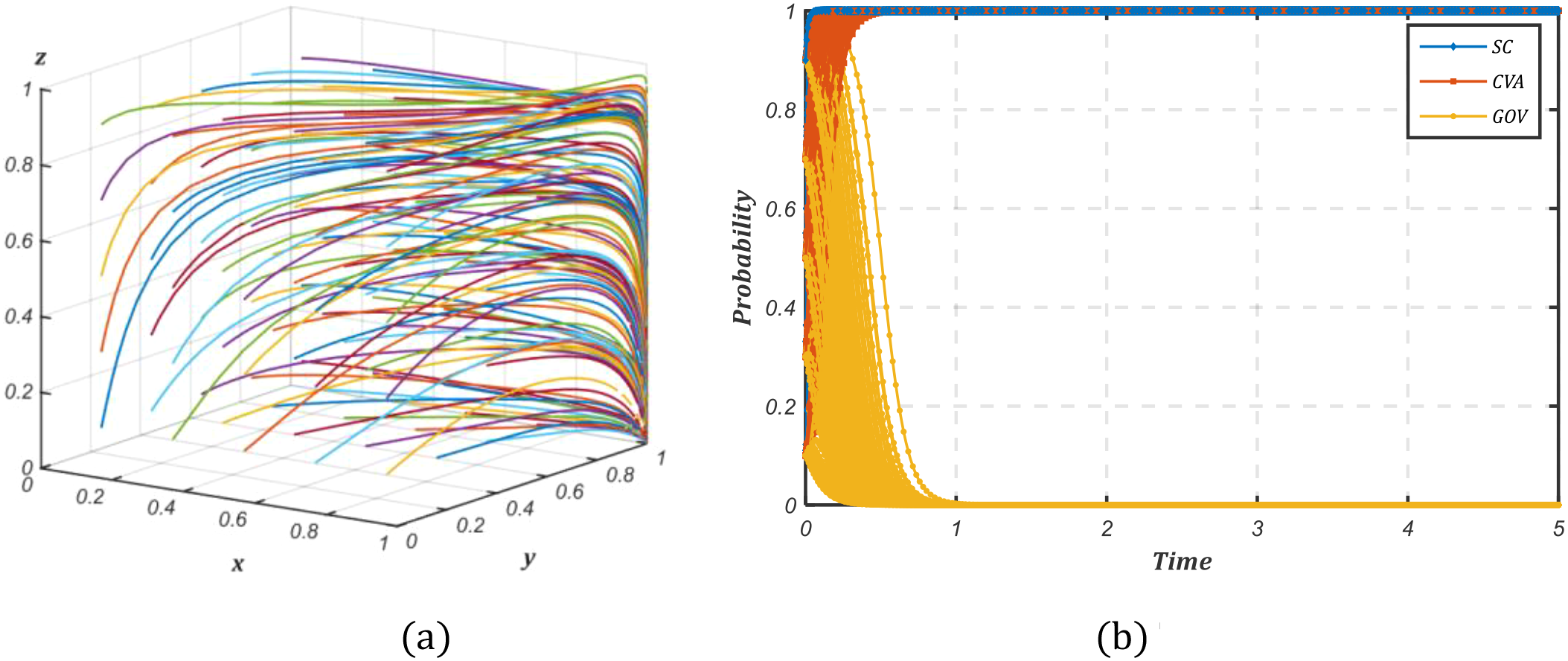 Let , , , and solve to obtain eight pure strategy equilibrium points are as follow: , , , , , , and . In addition, there are several mixed strategy equilibrium points in the system. Because the mixed strategy equilibrium points do not satisfy the constraint conditions required by the strict Nash equilibrium definition based on the Lyapunov stability criterions (Parks, 1992), these points are not considered.