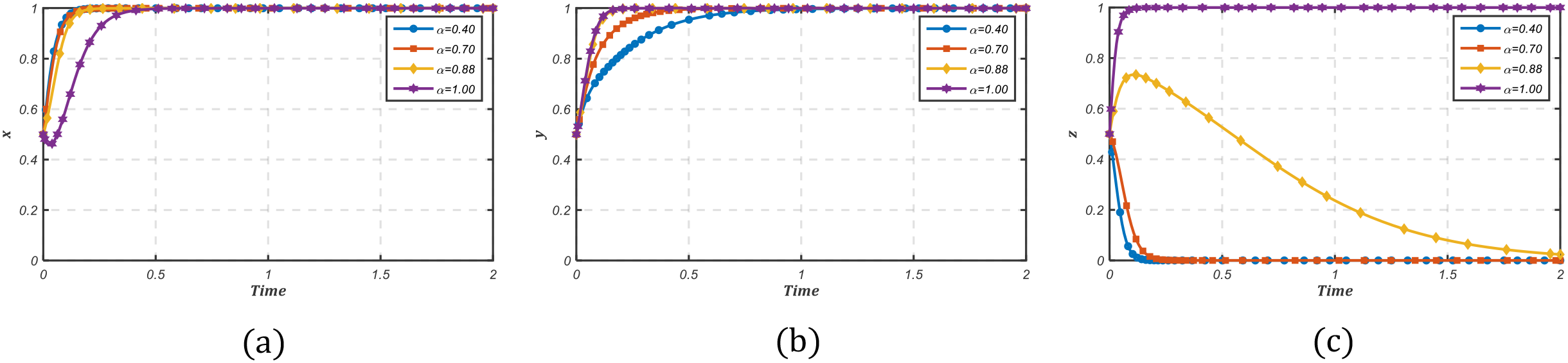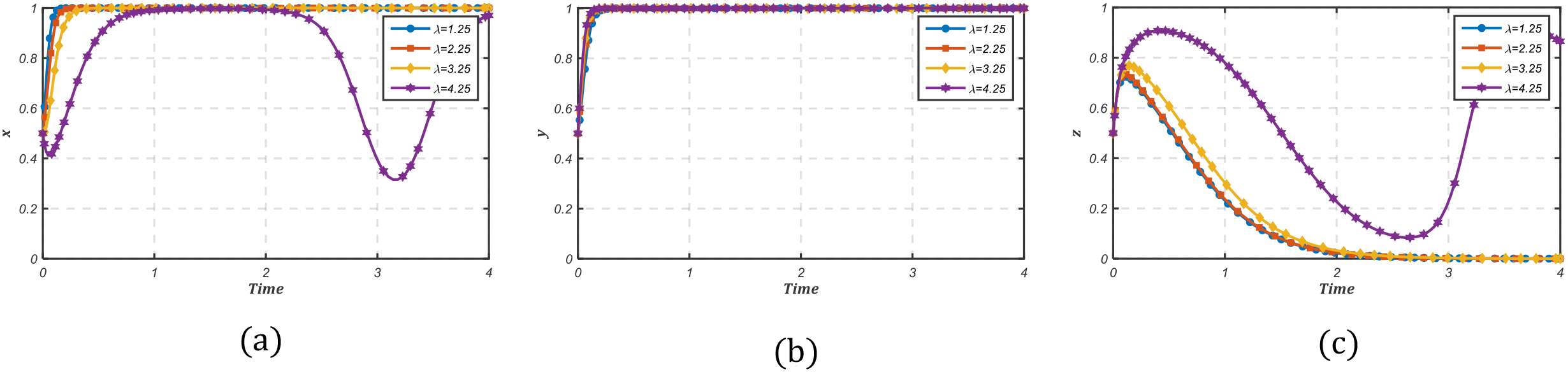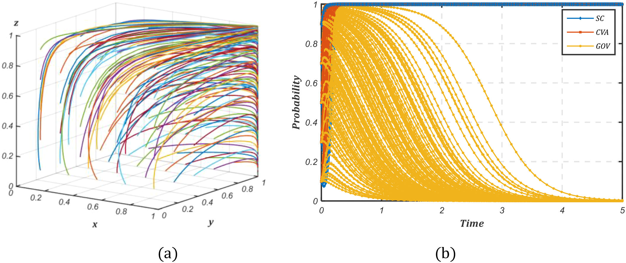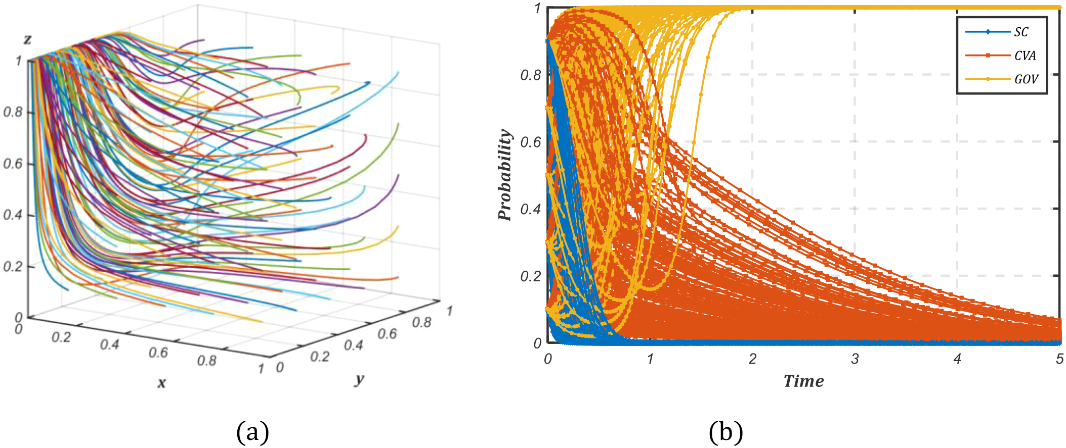 Let , , , and solve to obtain eight pure strategy equilibrium points are as follow: , , , , , , and . In addition, there are several mixed strategy equilibrium points in the system. Because the mixed strategy equilibrium points do not satisfy the constraint conditions required by the strict Nash equilibrium definition based on the Lyapunov stability criterions (Parks, 1992), these points are not considered.