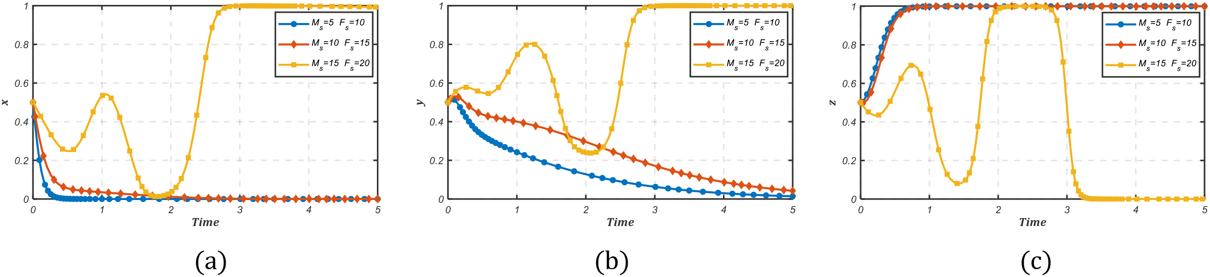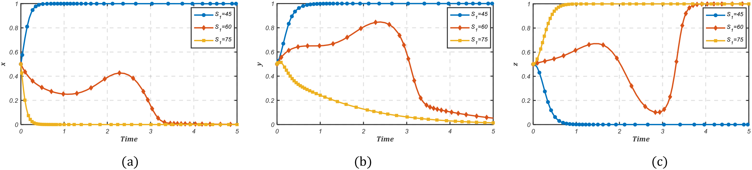 According to the operation rule, , are iteratively calculated and substituted into Equation 10 to obtain the replication dynamic equation under prospect theory and its first-order derivative with respect to y, which are presented in Equations 11, 12, respectively: