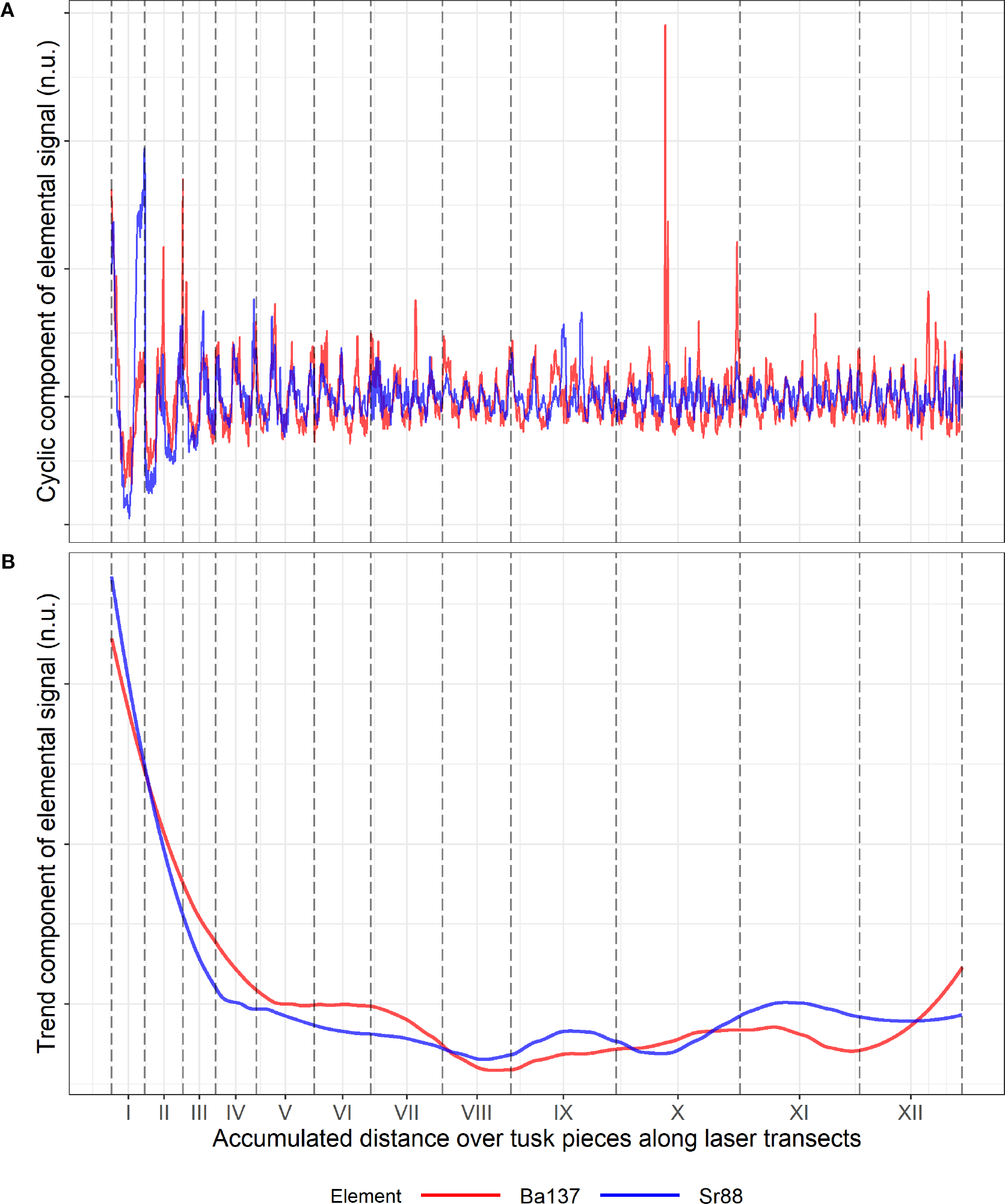 Standardized (no units; n.u.) signals of Ba (red) and Sr (blue), separated into a cyclic component (A) and a trend component (B) for 12 tusk pieces from tusk 956. Standardization was done by dividing each observation with the standard deviation of the signal. The trend was then obtained using local polynomial regression, with a span parameter equal to 30% of neighboring points. Vertical dashed lines mark transitions between tusk pieces. For this specific tusk, the Spearman correlation between Ba and Sr is 0.6 and 0.71 for the cyclic and trend component, respectively.