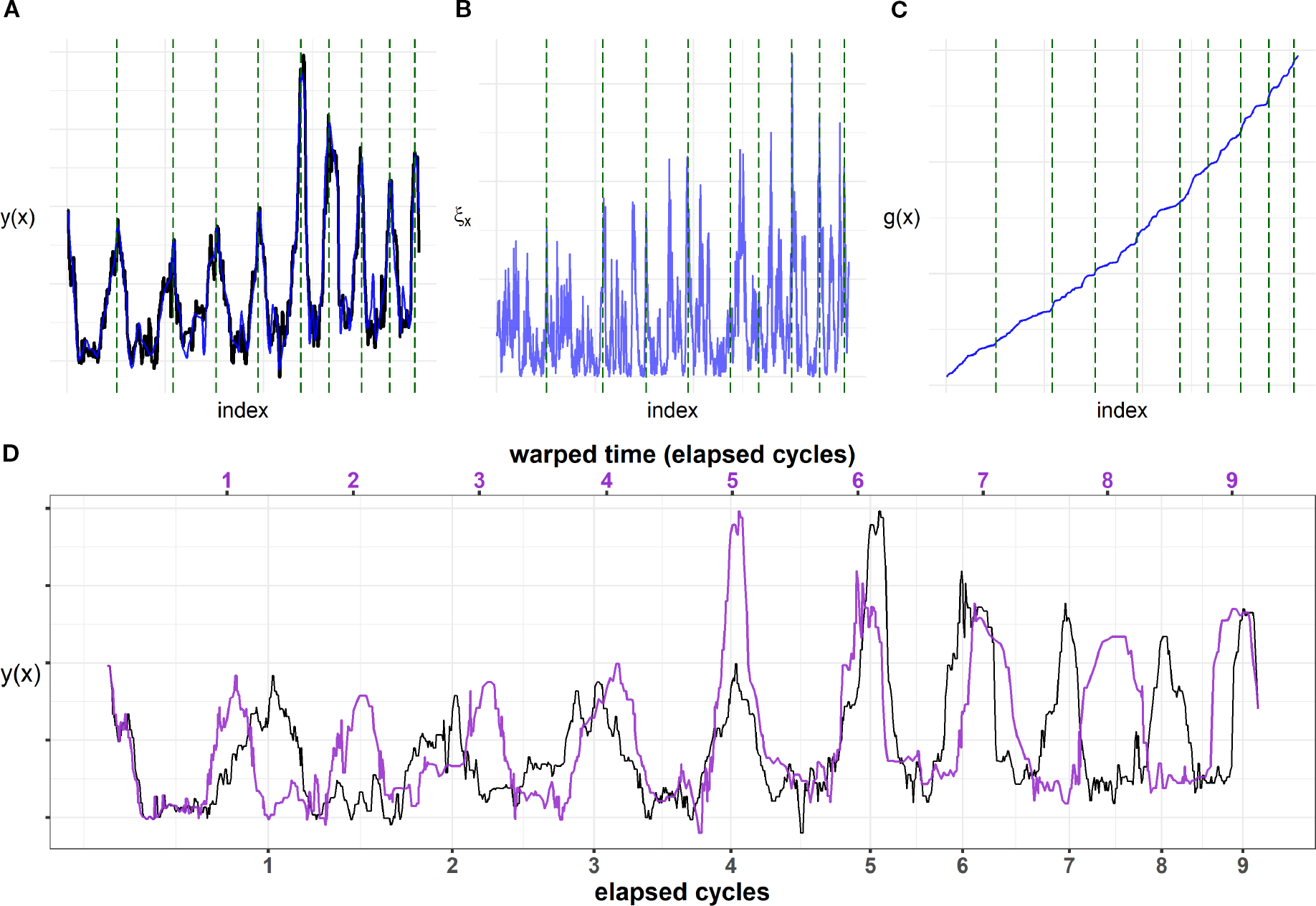 In this section, we introduce the time-warping model fitted to the average Ba–Sr signals, which display cyclic patterns reflecting narwhal migratory behavior. These cycles alternate between larger and smaller peaks due to seasonal differences. We account for this by modeling the average dynamics as a sum of sinusoidal components, or “waves”, where the dominant wave models the overall annual dynamics and the second wave corrects for any shift in concentration between seasons. Because tusk growth rate vary over time, e.g., due to poor feeding year or illness, the rates are modeled stochastically, leading to a more realistic representation of the signal dynamics.