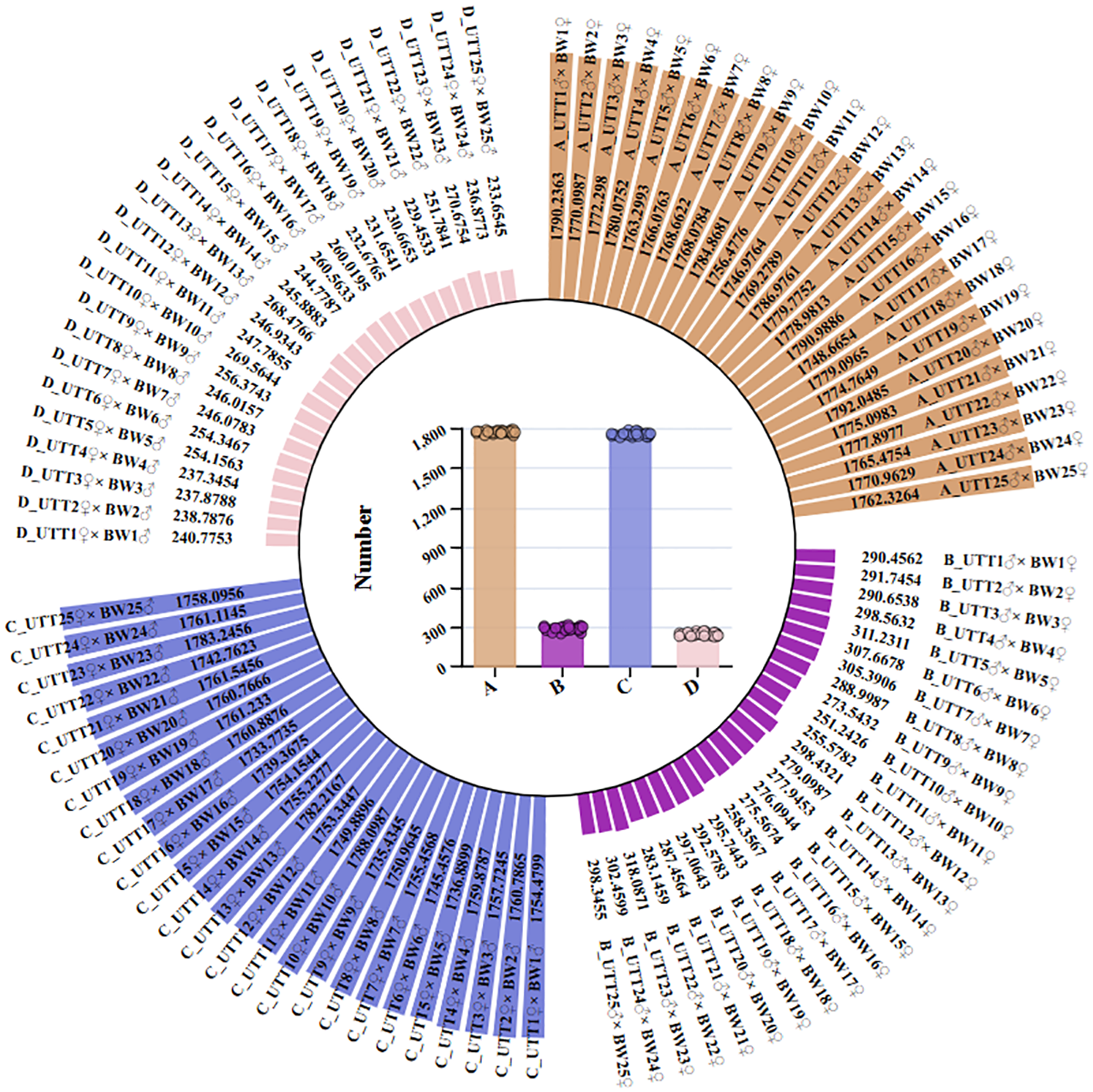The phenotypic values for UTT/h and BW/g traits in turbot families. (A) The phenotypic values for UTT in cross combination. (B) The phenotypic values for BW in cross combination. (C) The phenotypic values for UTT in reciprocal combination. (D) The phenotypic values for BW in reciprocal combination.