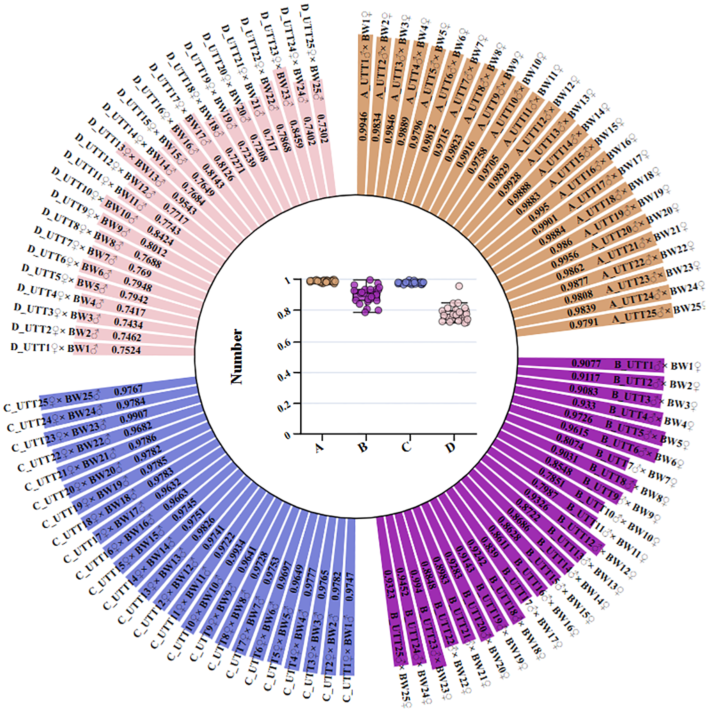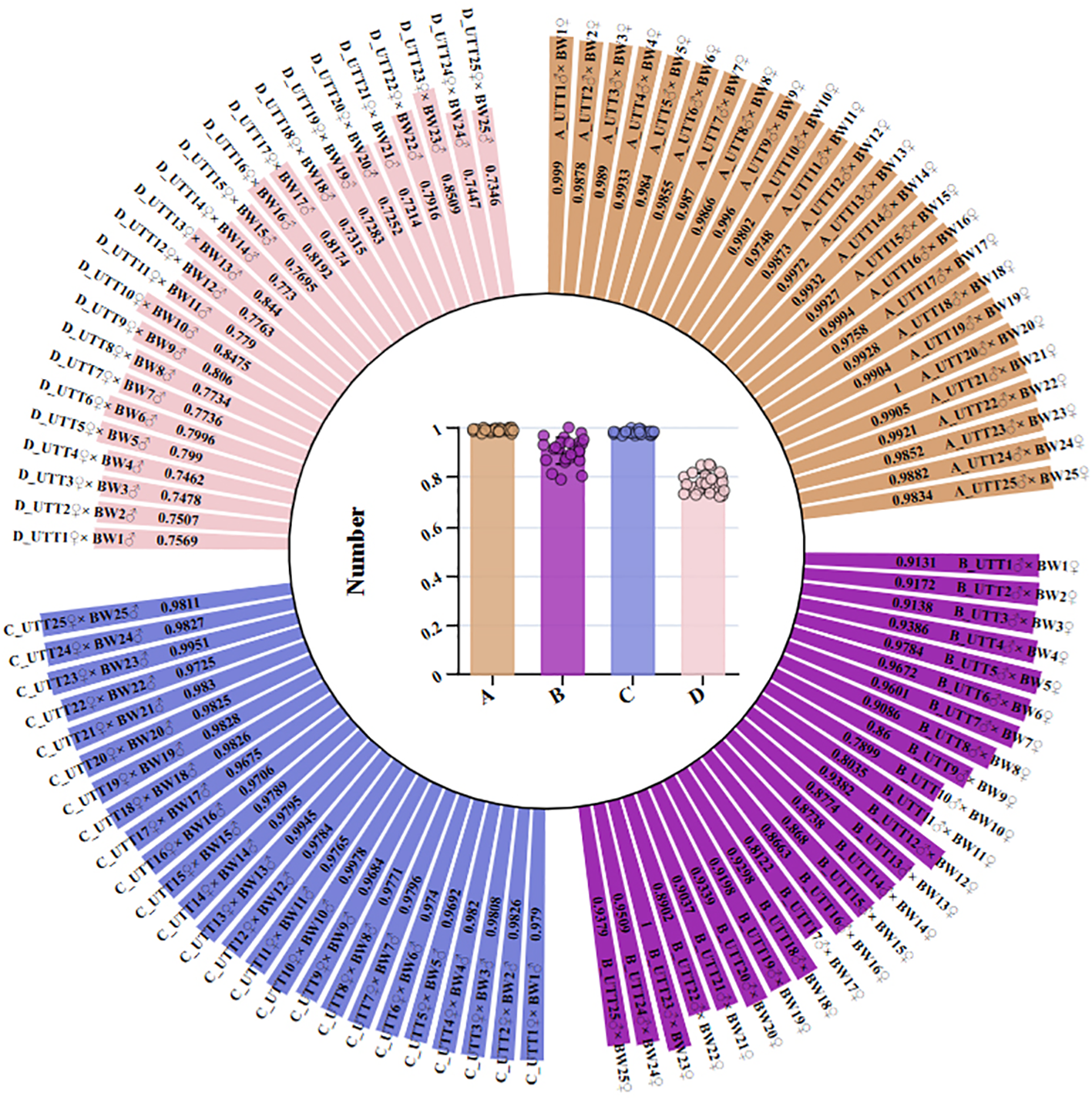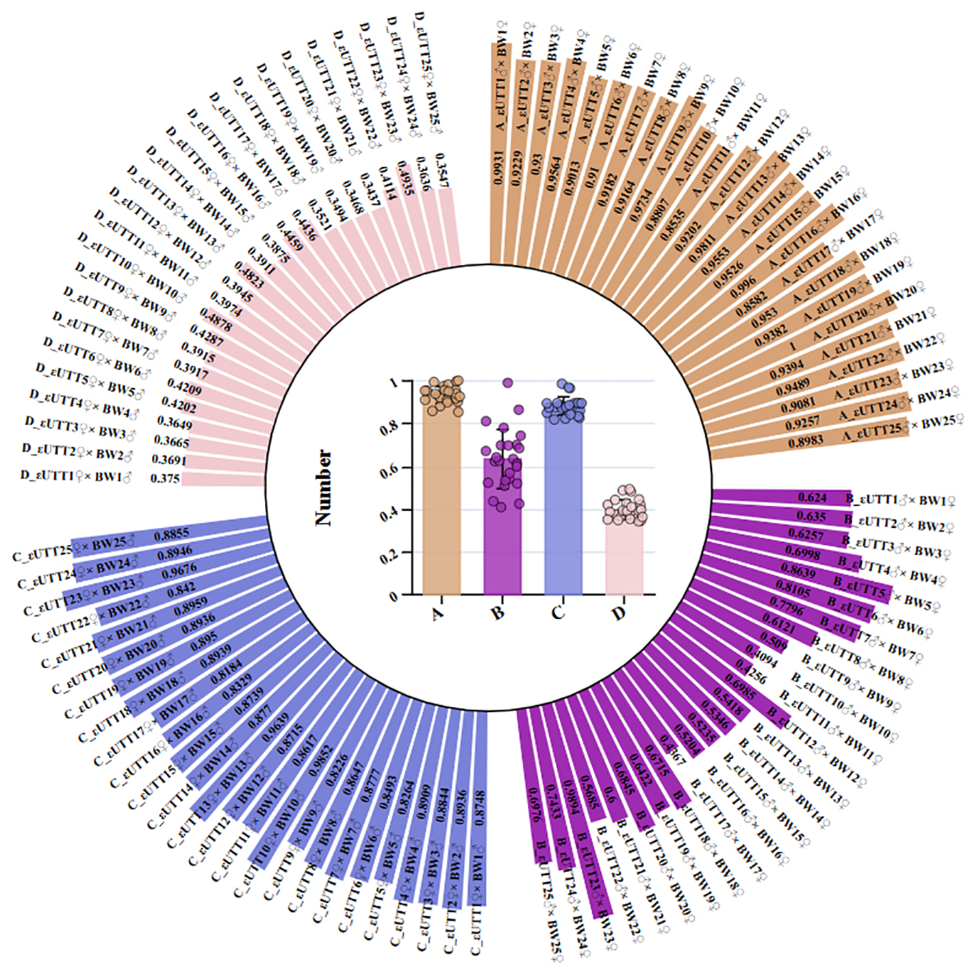The grey relational coefficients for UTT and BW traits across different turbot families. (A) The grey relational coefficients in UTT among different cross combinations. (B) The grey relational coefficients in BW among different cross combinations. (C) The grey relational coefficients in UTT among different reciprocal combinations. (D) The grey relational coefficients in BW among different reciprocal combinations.
