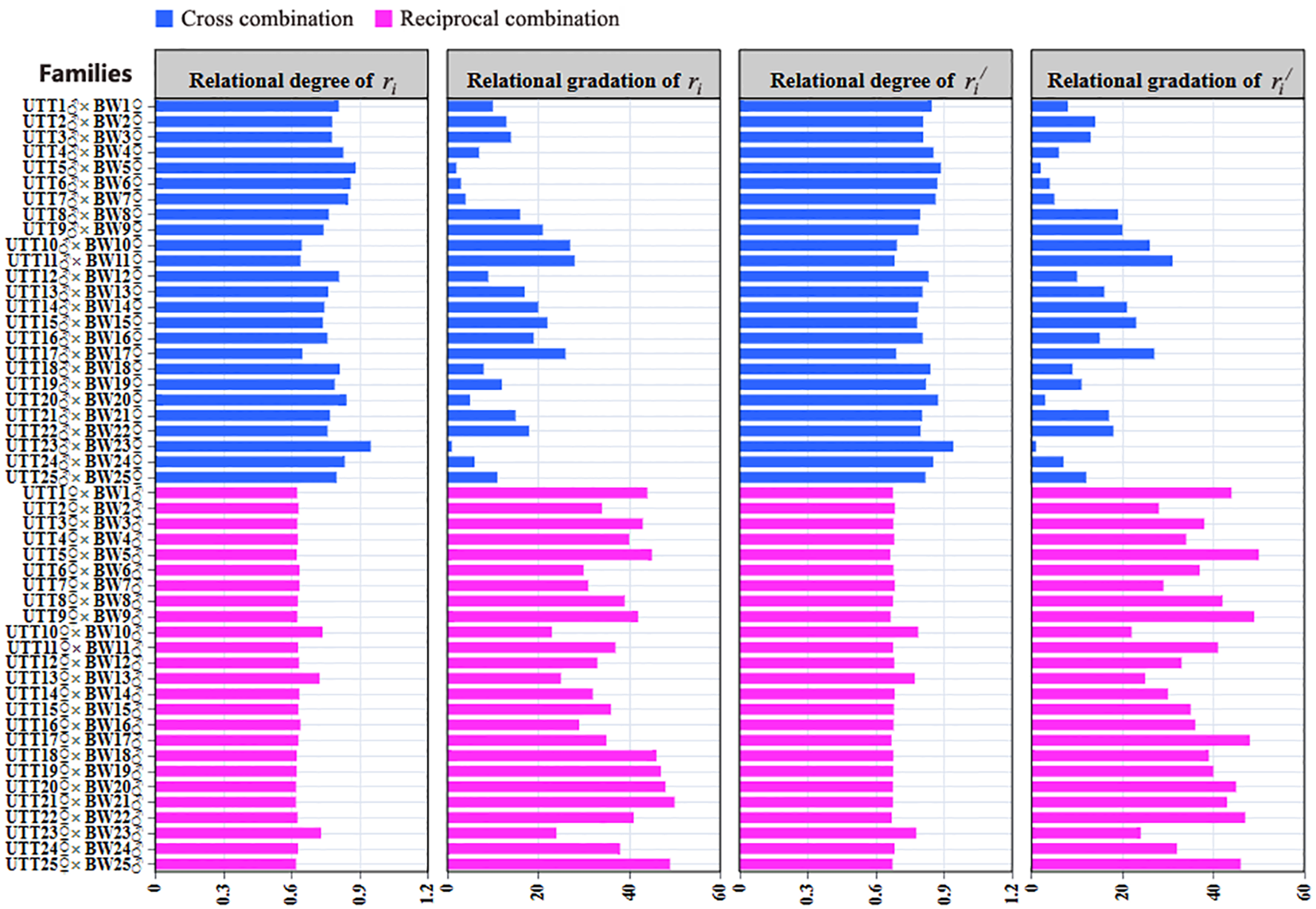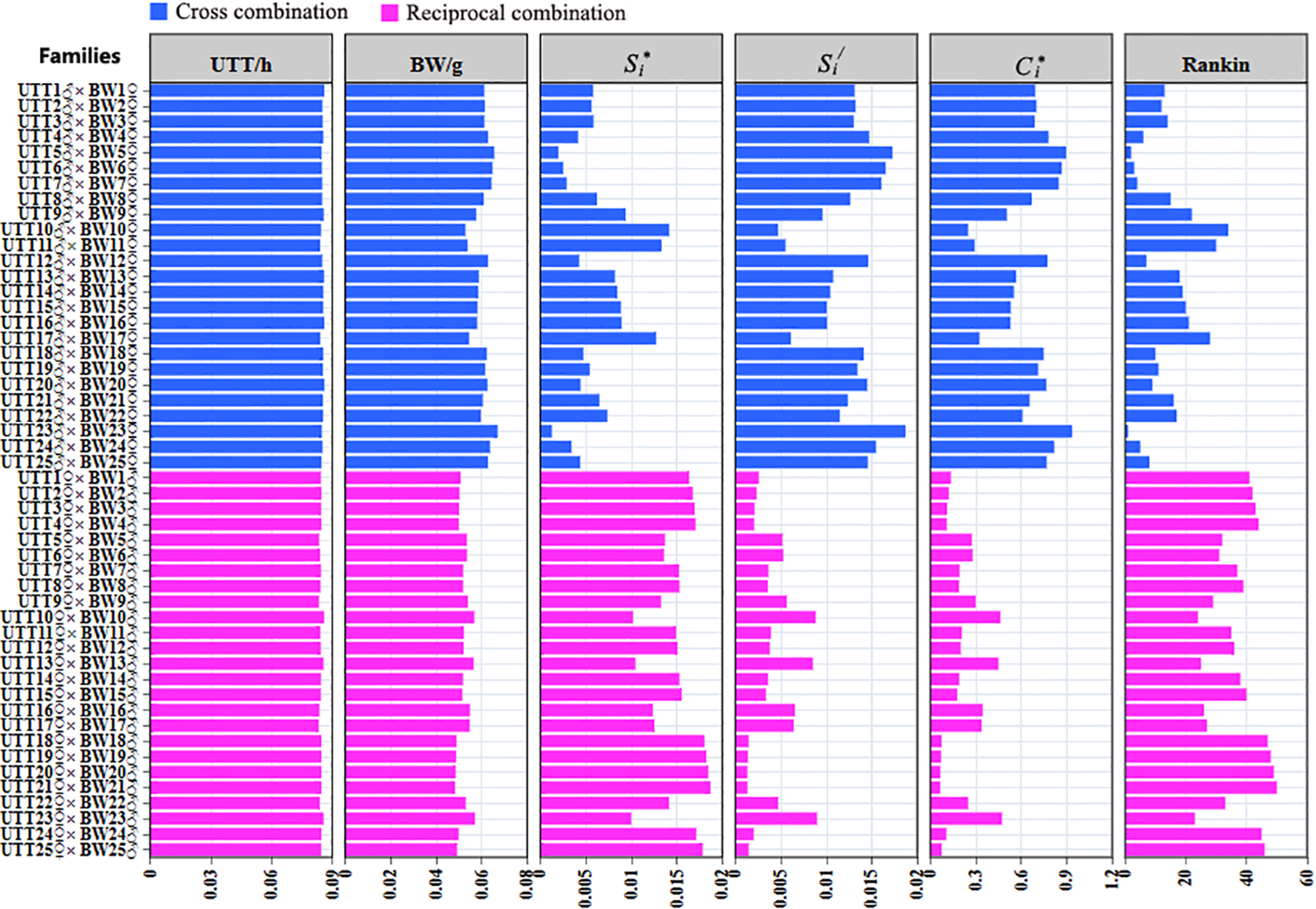 The GRA showed that the ranges of the equal relational grade and the weighted relational grade were 0.61984–0.94876 and 0.66391–0.94063, respectively. The relational gradation of the equal relational grade and the weighted relational grade of 25 UTT♂ × BW♀ families were higher than those of 25 UTT♀ × BW♂ families, except for UTT10♂ × BW10♀, UTT11♂ × BW11♀, and UTT17♂ × BW17♀ families. UTT23♂ × BW23♀ had the highest equal relational grade and weighted relational grade. TOPSIS analysis results showed that the range of Ci* of the 50 families was 0.066614–0.936093. The Ci* values of 25 UTT♂ × BW♀ families were higher than those of 25 UTT♀ × BW♂ families except for UTT10♂ × BW10♀, UTT11♂ × BW11♀, and UTT17♂ × BW17♀ families. The UTT23♂ × BW23♀ family had the highest Ci*.