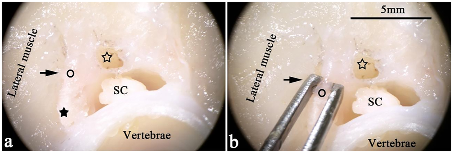 Transverse sections of T. rubripes at the cranial thoracic segment. ○, spinal canal membrane; ★ (black star), medullary arch; SC (spinal cord), spinal cord; ☆ (hollow star), dorsal lumen of the spinal canal. (A, B) The pictures show the connection between the lateral muscle and the spinal canal membrane (→) under a stereomicroscope. A “lumen” (☆) of the same length and parallel to the spinal canal is on the back of the spinal canal. (B) The thickness of the spinal canal membrane is approximately 1 mm.