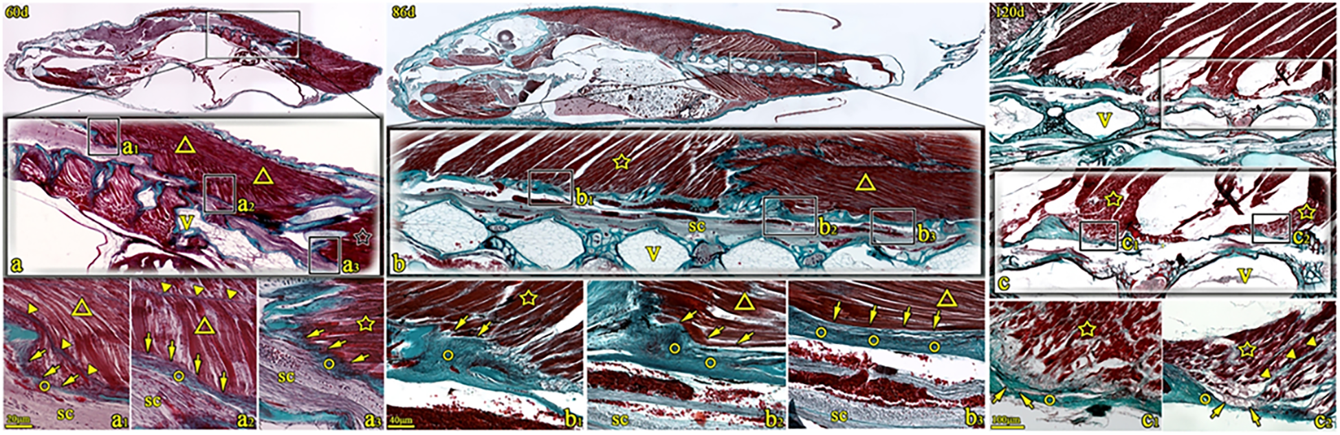 Sagittal sections of T. rubripes at 60, 86, and 120 dph (Masson’s trichrome stain). V, vertebra centrum; ○, spinal canal membrane; ☆, dorsal fin muscle; ▼, myocomma; △, lateral muscle; SC, spinal cord; → (arrow), connection between muscle and membrane. a1–a3, b1–b3, and c1–c2 are high-magnification views of the squares in a–c. The spinal canal membrane (○) intermittently seals the dorsolateral spinal canal. The dorsal fin muscle (☆) obliquely inserts into the spinal canal membrane (○) structure (→, a3 and b1). Alternatively, the epimysium is connected to the spinal canal membrane (○) (→, c1 and c2). Muscle fibers of the major lateral muscle (△) connect with the spinal canal membrane (→, a1 and a2). Alternatively, the muscle fibers of the lateral muscle attaching to the membrane (○) (→, b2 and b3).