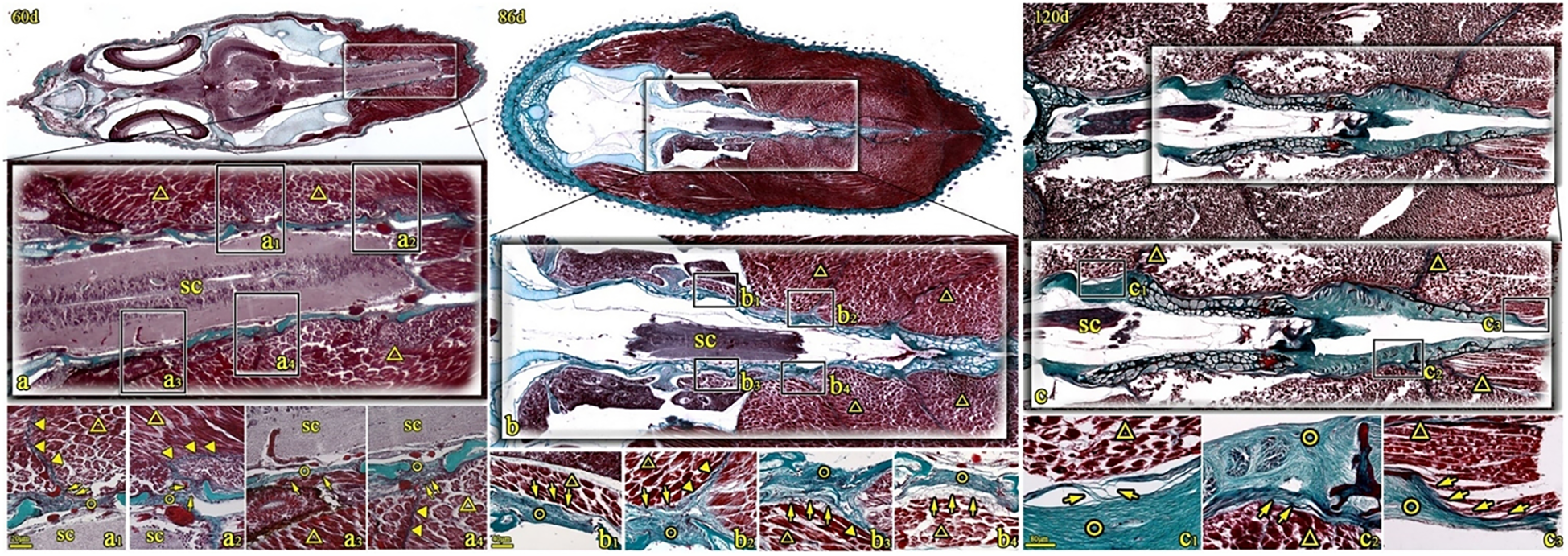 Coronal sections of T. rubripes stained with Masson’s stain at 60, 86, and 120 days. ○, spinal canal membrane; △, lateral muscle; ▼, myocomma; SC, spinal cord; →, connection between muscle and membrane. a1–a4, b1–b4, and c1–c3 are high-magnification views of the squares in (A–C). The spinal canal membrane (○) intermittently seals the dorsolateral spinal canal. The epimysium of the lateral muscle (△) is directly attached to the membrane (○) (→, a3, b1, b3, and c2) or connected to the spinal canal membrane through reticular fibers (→, b4) and some filamentous fibers (→, c1). Some lateral muscles (△) are obliquely inserted into the spinal canal membrane (○) through the fibers at the end of the muscle bundle (→, c3). The myocomma (▼) is directly attached to the spinal canal membrane (a1, a2, a4, and b2).