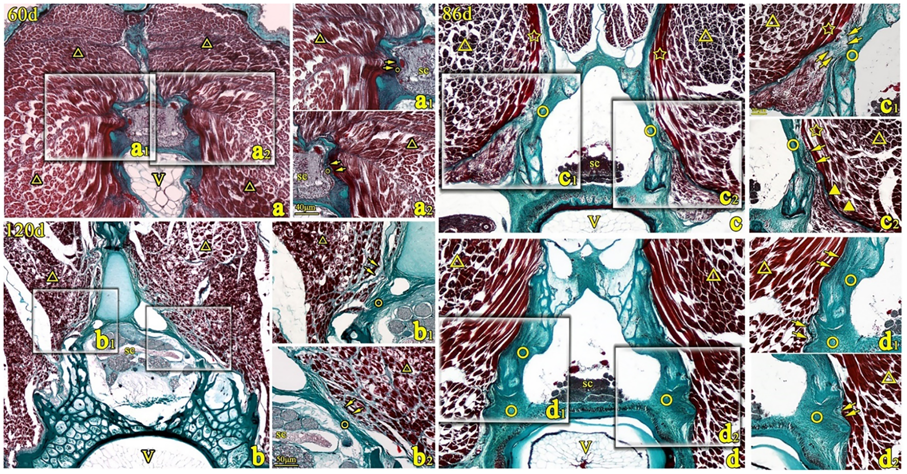 Transverse sections of T. rubripes with Masson’s stain at 60, 86, and 120 days. V, vertebral centrum; ○, spinal canal membrane; △, lateral muscle; ▼, myocomma; SC, spinal cord; →, connection between muscle and membrane. a1, a2, b1–b3, c1, c2, d1, and d2 are high-magnification views of the squares in (a–d). The epimysium of the lateral muscle (△) is directly connected to the spinal canal membrane (○) (→, a1, a2, d1, and d2) or the fibers emitted by the perimysium are collected into the epicardium and connected to the spinal canal membrane (○) (b1 and b2) or connected to the spinal canal membrane through a reticular connective tissue (→, c1). The myocomma (▼) of the lateral muscle is directly attached to the membrane (→, c2).