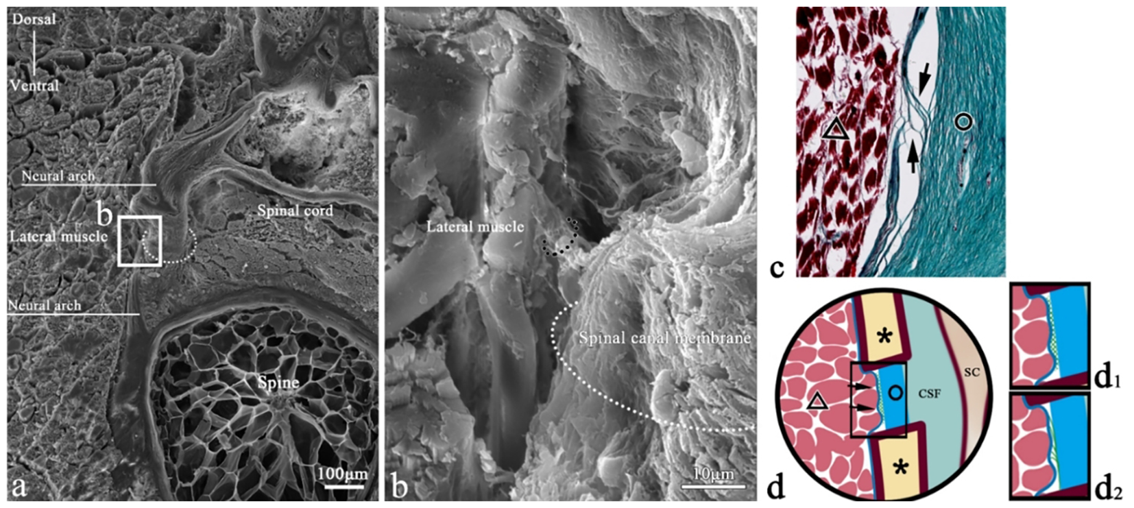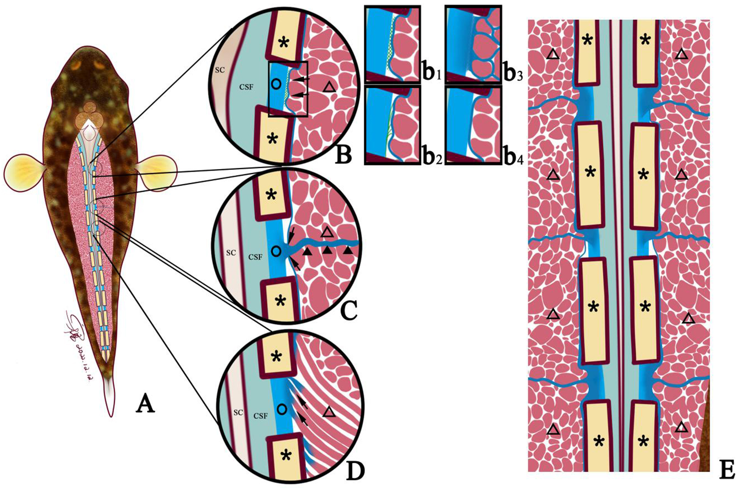 Diagram showing three connection modes between muscle and spinal canal membrane. ○, spinal canal membrane; △, lateral muscle; ▲, myocomma; SC, spinal cord; *neural spine; SC, spinal cord; CSF, cerebrospinal fluid; →, connection between muscle and membrane. (A) The connection (→) between the lateral muscle (△) and the spinal canal membrane (○) can be observed in each intervertebral space. (B) Connection between the epicardium and the spinal canal membrane (→); that is, the epicardium is connected to the spinal canal membrane (○) through reticular fibers (b1), filamentous fibers (b2), and perimysium converging to the epicardium (b3), and the epicardium is directly attached to the spinal canal membrane (○) (b4). (C) The lateral muscle (△) is connected to the spinal canal membrane (○) through the myocomma (▲). (D) The lateral muscle or dorsal fin muscle is connected to the spinal canal membrane (○) through the fiber (→) emitted from the end of the muscle bundle. (E) Coronal view of the myocomma (▲) of the lateral muscle symmetrically attached to the spinal canal membrane (○).