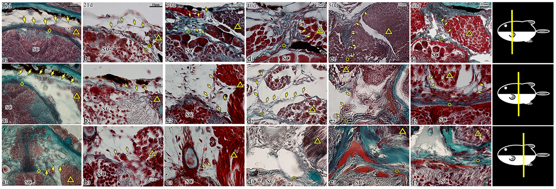 Transverse sections of the dorsal spinal canal in T. rubripes (18–60 dph, Masson’s stain). ◇, spinal cord membrane; ○, spinal canal membrane; △, muscle; SC, spinal cord; →, connection between muscle and membrane; (A1–F1), cranial segment of the thoracic vertebra; (A2–F2), middle segment (junction of the thoracic segment and caudal segment); (A3–F3), cranial segment of the caudal vertebra. (A1–A3), a small amount of fibers (→) is emitted by the muscles and stops at the spinal cord membrane (◇). (B1), the fibers (→) emitted by the muscles stop at the spinal canal membrane (○). (A1–F1, A2–F2), the membrane outside the spinal cord gradually becomes denser, and the connection between the muscle and the spinal canal membrane (→) gradually strengthens; (A3–F3), the connection between the muscle and spinal canal membrane (→) is sparse (A3–C3) and disappears from d3 (D3–F3).