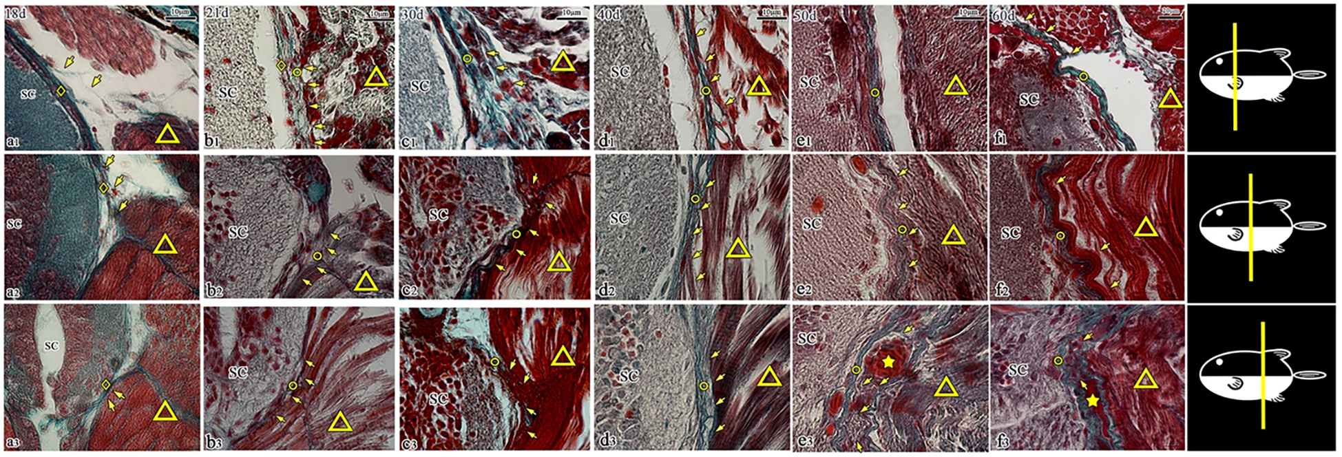 Transverse sections of the spinal canal in T. rubripes (18–60 dph, Masson’s stain). ◇, spinal cord membrane; ○, spinal canal membrane; △, muscle; SC, spinal cord; ★, vascular structure; →, connection between muscle and membrane; (A1–F1), cranial segment of the thoracic vertebra; (A2–F2), middle segment (the junction of the thoracic segment and caudal segment); (A3–F3), cranial segment of the caudal vertebra; (A1–F1), the fiber connection (→) begins to disappear at e1; (A2–F2, A3–F3), the muscle fibers (△) gradually become fuller, and their connection with the spinal canal membrane (→) is gradually enhanced; e3, f3, filamentous fibers from the epicardium of the lateral muscle (△) are distributed around the vascular structure (★) and connected to the spinal canal membrane (○).