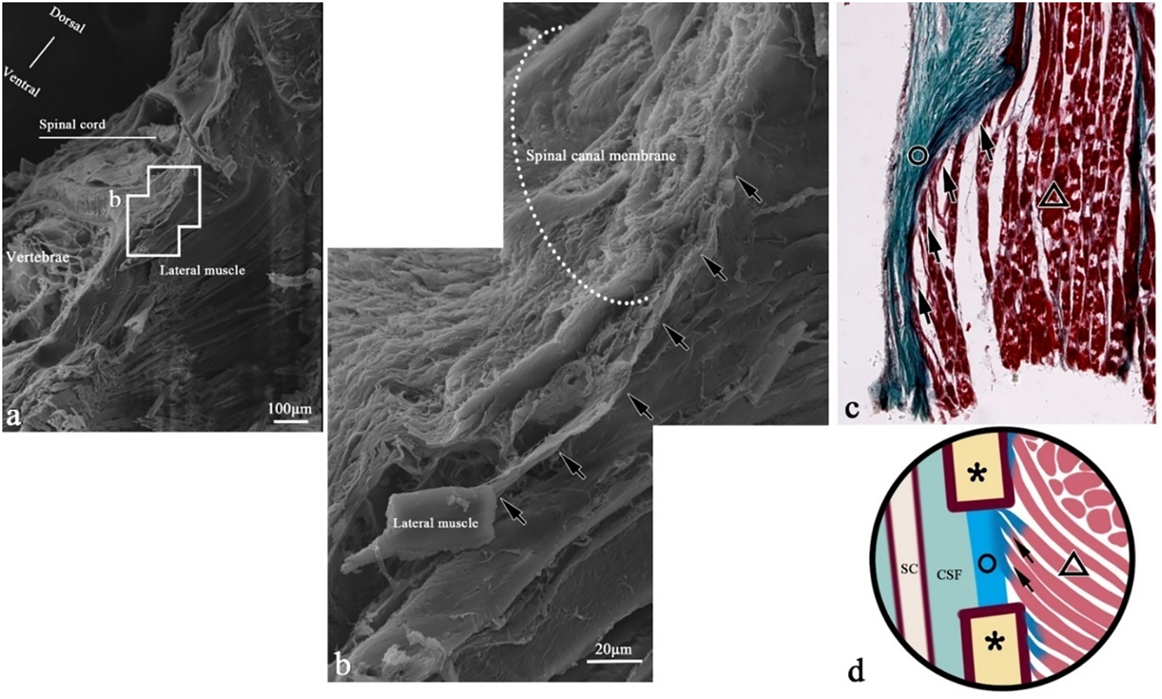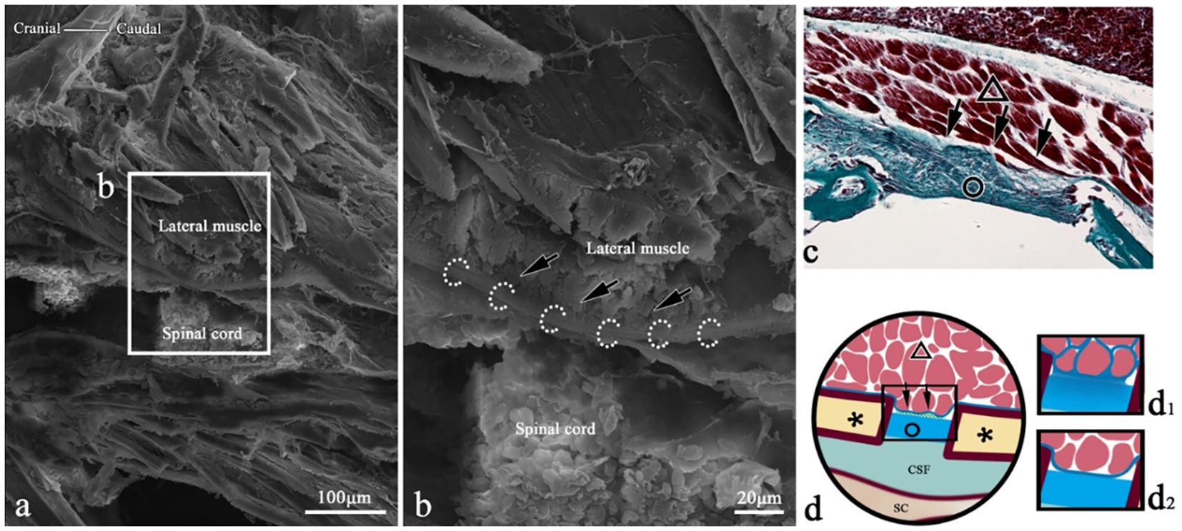 SEM of myocomma connection in a transverse section of T. rubripes. △, skeletal muscle; black dotted line/▲, myocomma; white dotted line, spinal canal membrane; *neural spine; SC, spinal cord; CSF, cerebrospinal fluid; →, connection between muscle and membrane. (B) High-magnification view of the square in (A). It shows that the myocomma (black dotted line) is connected to the spinal canal membrane (white dotted line), interwoven with the spinal canal membrane and integrated. (C) Histological section corresponding to (A); Masson staining, showing skeletal muscle (△) attached to myocomma (▲) and myocomma connected to the spinal canal membrane (○). (D) Connection pattern diagram of myocomma.