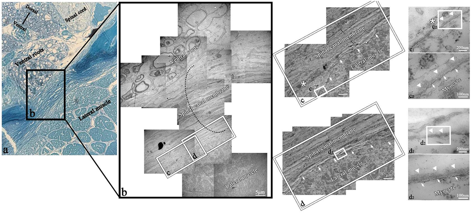 TEM of myocyte–fibroblast interface in the transverse section of T. rubripes. Black dotted line, spinal canal membrane; *fibroblast; SC, spinal cord; CSF, cerebrospinal fluid; →, connection between muscle and membrane; △, connection between myocytes of the lateral muscle and fibroblasts of the spinal canal membrane. (A) Semi-thin section showing the overall positional relationship of the lateral muscle, spinal canal membrane, spinal cord, and nerve roots. (B) TEM diagram of (A), and the black dotted line shows the thickness of the spinal canal membrane (×2,500). (C, D) High-magnification views of the square in (B). The lateral muscle is closely attached to the spinal canal membrane (→) (×15,000). c1, d1, high-magnification views of the square in (C, D), which show the connection between myocytes and fibrocytes or fibroblasts (×120,000). c2, d2, high-magnification views of the square in c1 and d1. It can be observed that the structure between the myocyte and fibroblast (*) is the myomembrane (→) and basement membrane (△) in turn (×300,000).