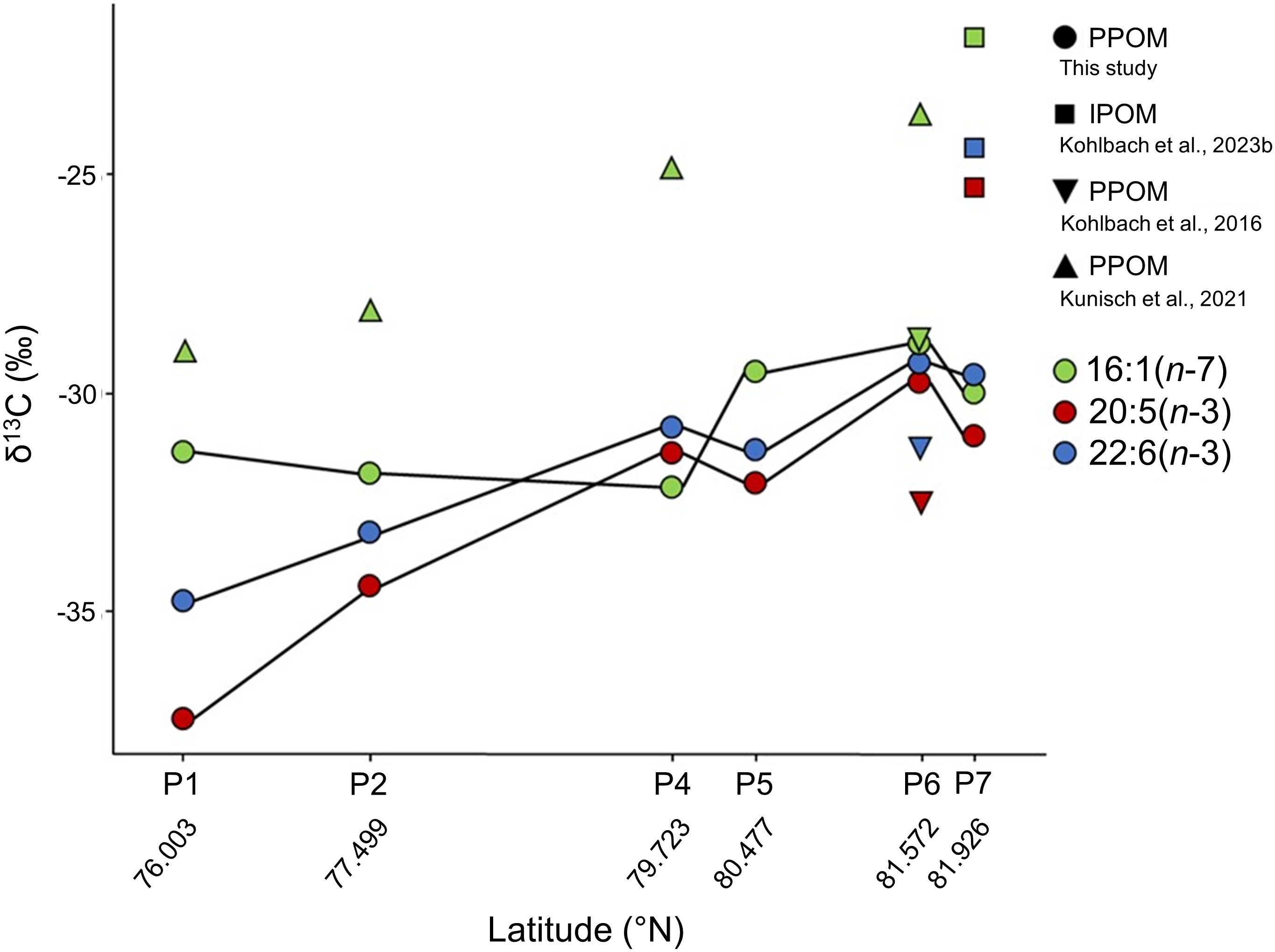 Interestingly, despite the fact that the two PUFAs are produced by different algal taxa, i.e., 20:5(n-3) predominantly by diatoms and 22:6(n-3) predominantly by (dino)flagellates/Phaeocystis (Dalsgaard et al., 2003), the δ13C values of 20:5(n-3) and 22:6(n-3) followed a very similar trend over the latitudinal gradient, with 20:5(n-3) being always more δ13C-depleted than 22:6(n-3). A similar pattern (i.e., lower δ13C values in 20:5(n-3)) was observed in the IPOM at P7 and the PPOM collected in August 2012 close to P6. As previously described (e.g., Sprecher, 2000; Baird, 2022), the PUFAs are both synthesized from FA 18:0 as a precursor, with 22:6(n-3) being eventually synthesized from 20:5(n-3) through elongation of its chain into 22:5(n-3) and then desaturation at the 4th carbon of the chain. The difference of δ13C values between 20:5(n-3) and 22:6(n-3), which ranged from 0.4 ‰ at station P6 to 2.7 ‰ at station P1, therefore likely corresponds to the isotopic fractionation issued after the combination of these two biochemical pathways. This likely reflects the distinct carbon fixation mechanisms in diatoms and dinoflagellates leading to unique isotopic fractionation even with similar PUFA biosynthetic pathways. Our preliminary results stress the need to better assess the processes involved in isotopic fractionation during biochemical reactions, in order to provide precise estimations of fractionation factors for each enzymatic reaction. Such estimations at the molecular scale would allow to holistically understand which processes lead to isotopic fractionation at the individual scale, but also at the scale of food webs, providing more robust estimates of organic matter fluxes in complex marine food webs. Ultimately, these molecular-level fractionation factors should be collected and summarized in review articles and databases, as has been done previously at the level of species or functional groups (Vander Zanden and Rasmussen, 2001; Stephens et al., 2023).